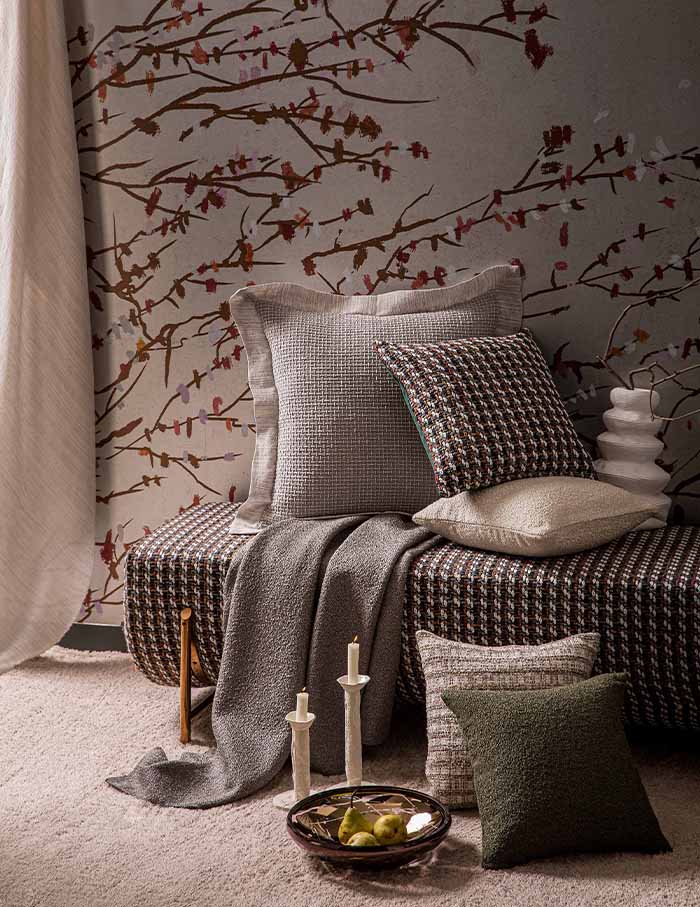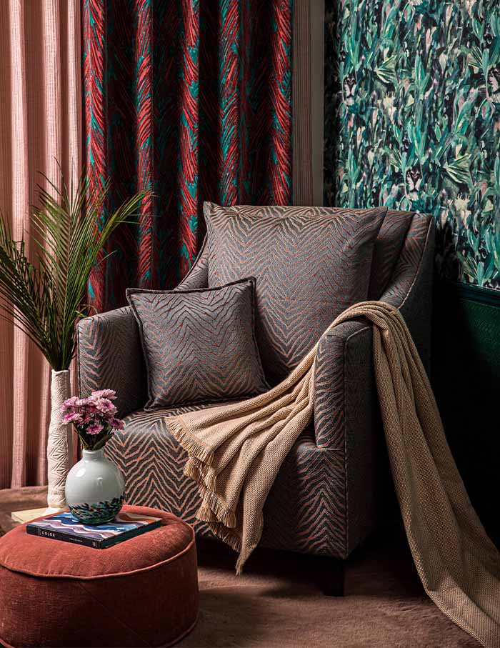 All kinds of textures, especially boucle fabrics and woven fabrics with natural yarns like linen are going to be a big trend this year, followed by that we believe rich velvet jacquards are going to be a hit as they exude warmth and luxury, and are perfect for heavy drapes as well as upholstery. A lot less polyester and a lot more viscose and natural yarns are going to trend for sure.