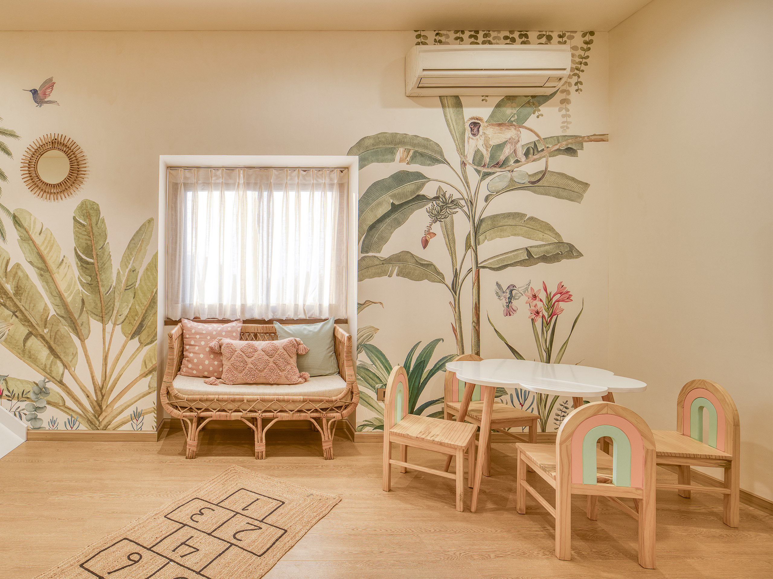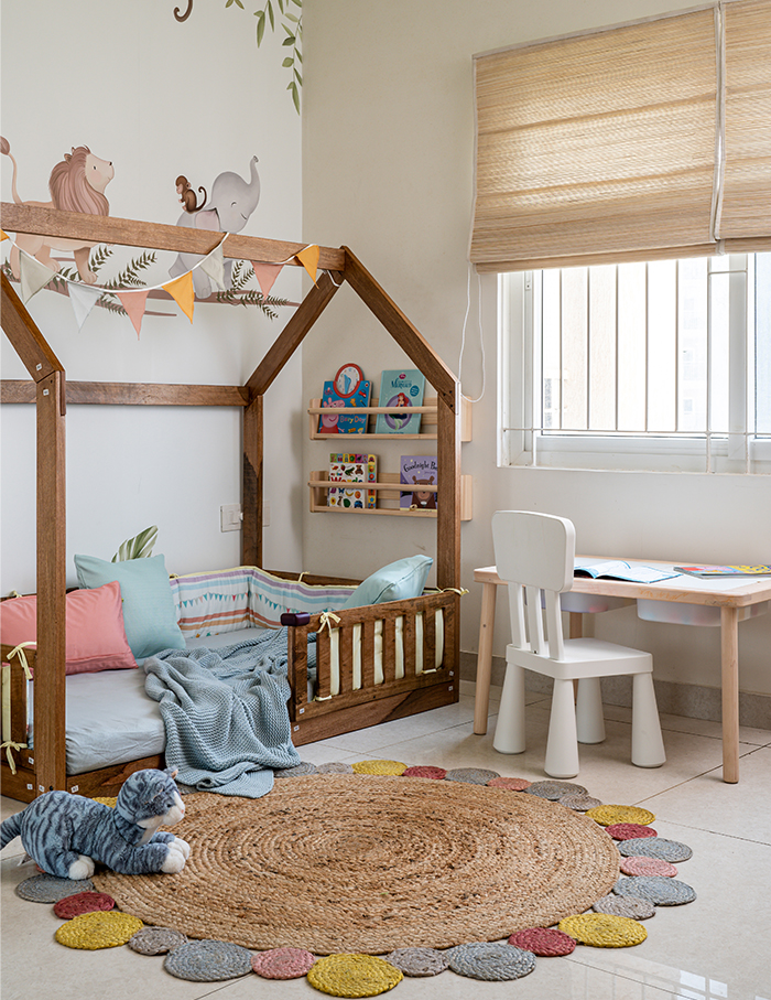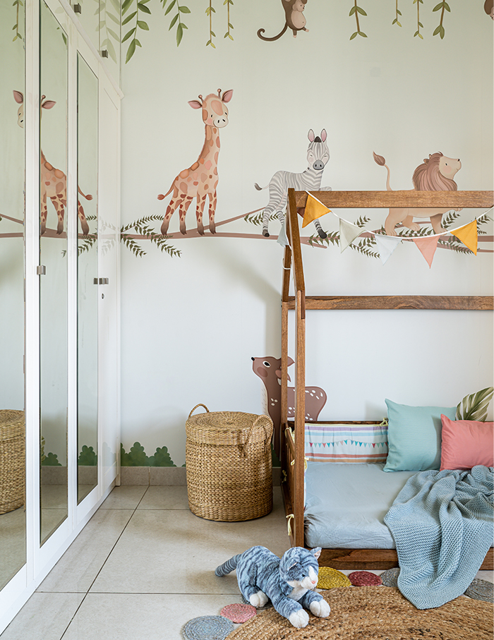 It’s every child’s dream to live in a treehouse amongst animals. Tejaswini. P, Founder, Furbishy, fulfils this reverie by designing this mellow but fun kid’s bedroom that’s a welcome to the (mighty) jungle. A wooden bed, resembling a tree house, sits against a whimsical backdrop of hand-painted cartoon animals that peek through creepers and walk on (astonishingly) strong branches. Tejaswini uses bamboo screens as windows and natural materials in rugs and storage bins to enhance the theme. The room adopts a soft colour scheme to imbibe some lightheartedness and also accommodates a small library. It uses various elements to enhance the children’s’ sensory experience subtly and playfully.