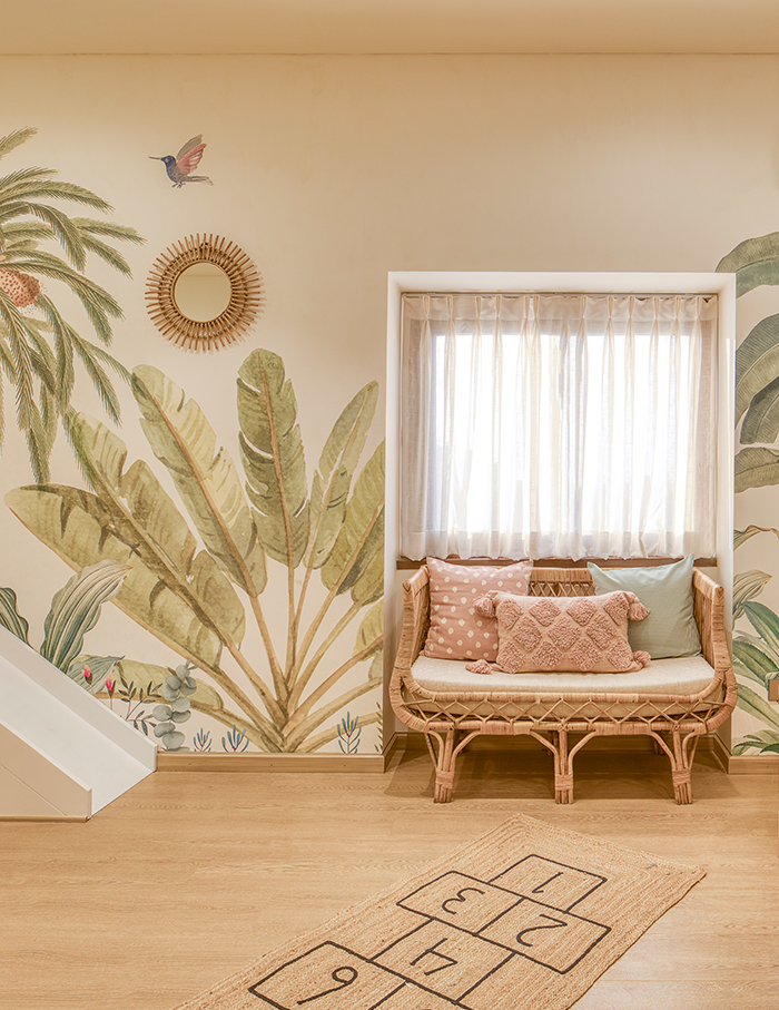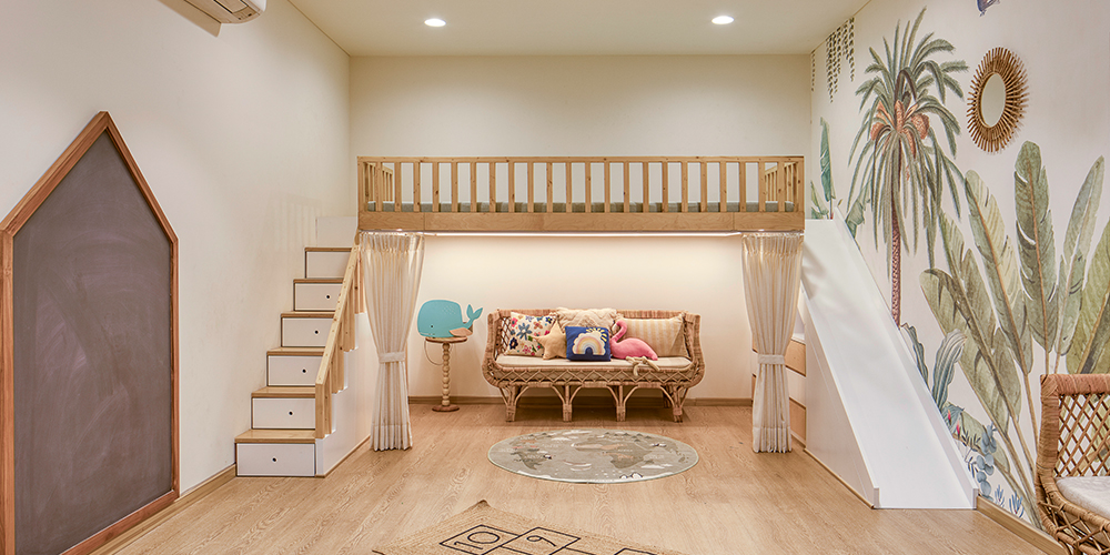 Birch ply with a natural wood finish, White Pu, and Bamboo sofas. Natural elements come together in all forms in this unique and subtle kid’s bedroom by Rootu Kinarivala, Designer and Founder, Frolik + Co. Polished wood stands against the quirky green wallpaper that draws imagination to the beauty of a forest. The spacious room uses minimal furniture to make it breathable and uncluttered. It accommodates a small table with small wooden chairs, the perfect place for some playdate games. The high ceiling calls for a wooden bunk-bed that delightfully attaches to a slide. A couch sits under the bed with an array of knitted cushions and soft toys.