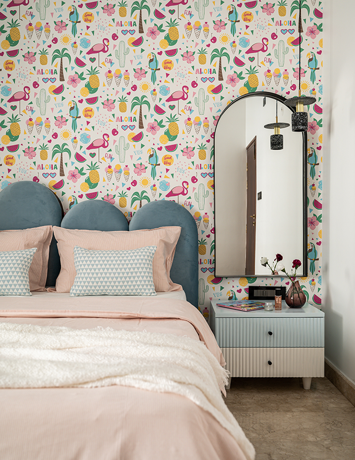 This Bengaluru home adopts a minimalistic style with a vivid, individualistic essence in every room. Keeping up with the theme is this fun kid’s bedroom designed by Deekshitha Sanjay and Ruthvik Prakash, Principal Architects, Inari Atelier & Architecture Saga. Pastel shades of blue and pink complement each other as vibrant-coloured doodles adorn the wallpaper. A tropical rug adorns the floor to add to the aesthetic. Simple and casual, the room leaves a lasting impression with its bright but subtle tones.