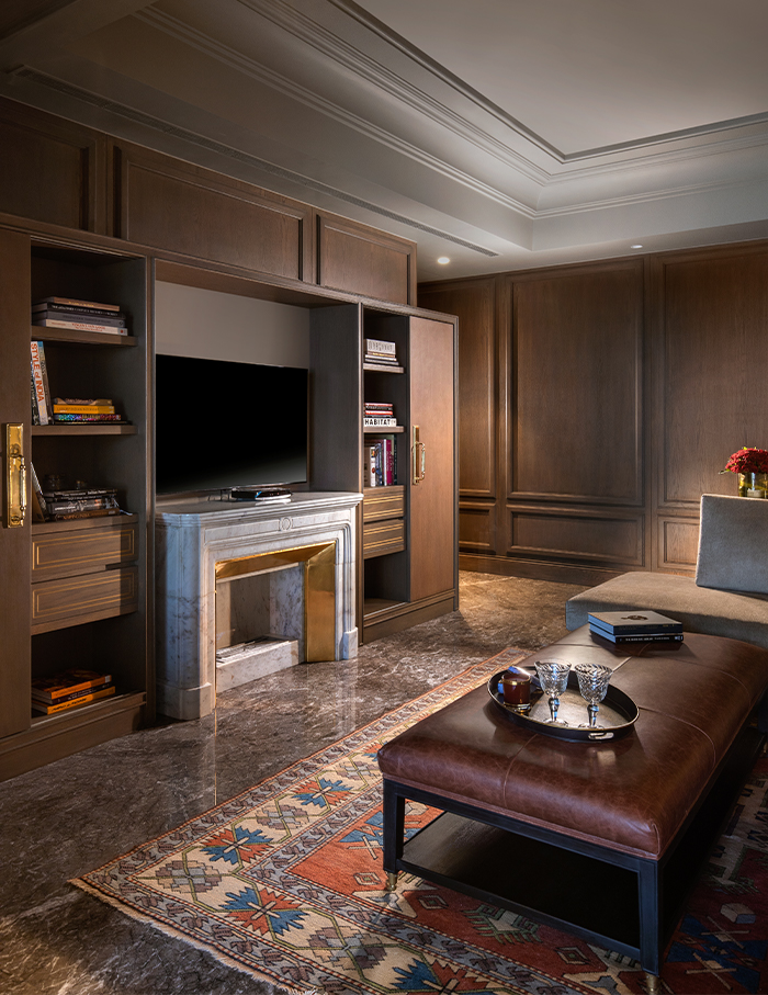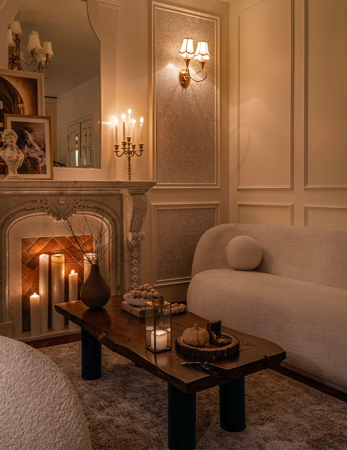 Extending a luxurious lounging experience, this fireplace design by Aparna Kaushik of her namesake Aparna Kaushik Design Group is set against the backdrop of a neutral and golden palette. The perfect setting for a laid-back winter evening — a fairy tale-inspired vintage seating, with drums on one end and a classic marble fireplace with a flickering flame of the candles on the other, the space has it all.