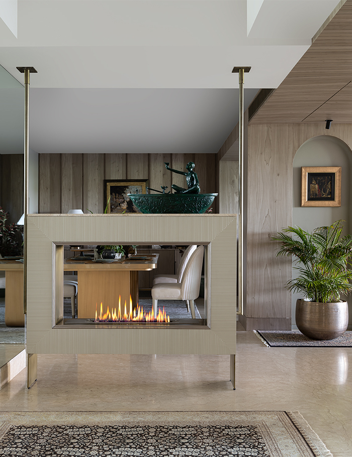 A fireplace in the middle of your home? The perfect addition to keep you warm all day long this winter. This contemporary fireplace designed by Saba Kapoor of Nivasa fuses form with function as it performs as a stunning space divider. Its sleek, suspended design features a glass-enclosed flame, offering a dynamic visual connection between spaces. The neutral palette and clean lines complement the modern theme of the home.