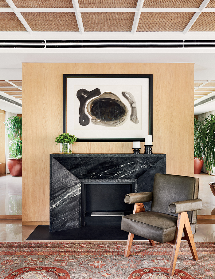 The pièce de résistance in the formal dining room of a vibrant New Delhi residence is this river-washed black riviera stone fireplace. Envisioned by Vaishali Kamdar of her eponymous Vaishali Kamdar Associates, the fireplace design is bold, dramatic and wondrously audacious. It commands attention and rightly so, sits as a sculptural piece in the midst of an art-filled home.