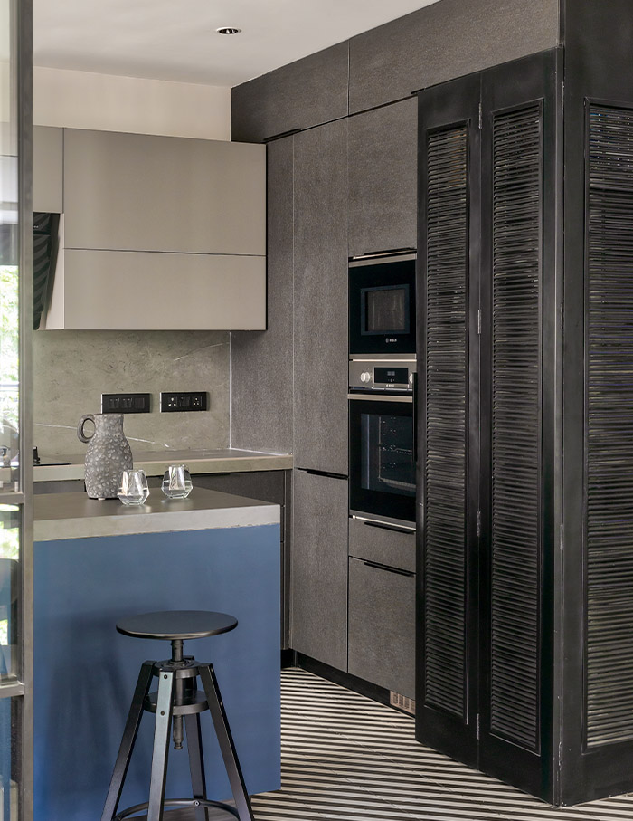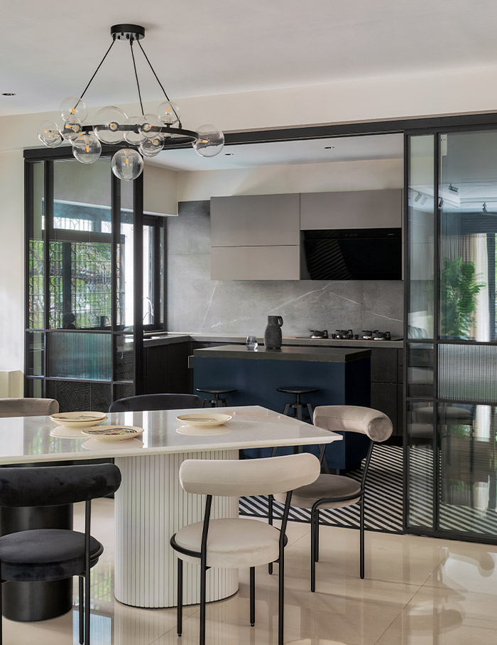 The open-plan kitchen is right by the dining table, its cool blue island rendered perfect against black shutters, bold striped flooring and grey finishes. Both blend seamlessly into the living room. Much like the striped kitchen floor, the dashing pop striped bar unit or the classical black-and-ivory inlay credenza by the dining table, little audacious corners of the home are conversation points.