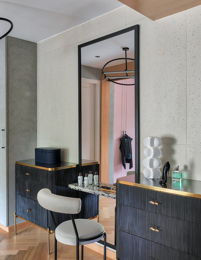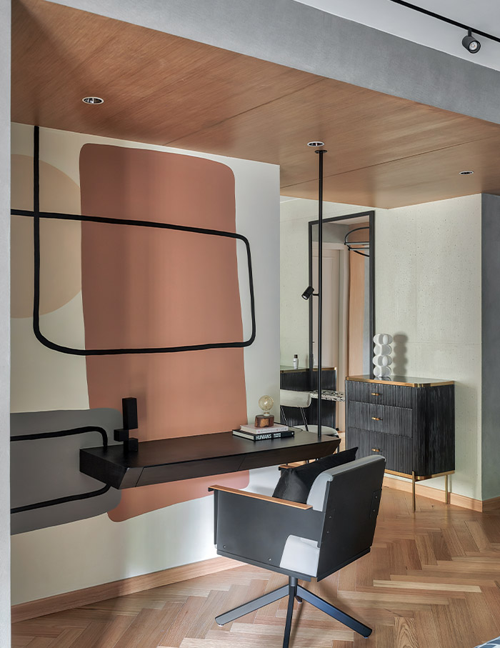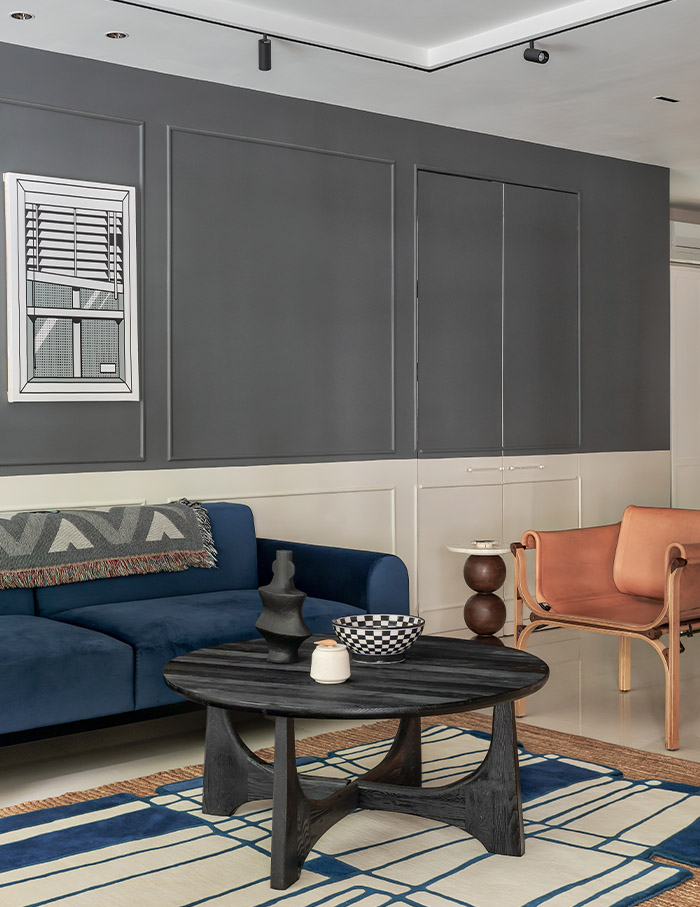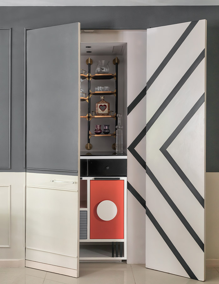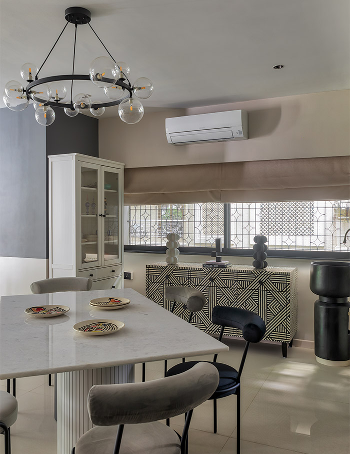 The highlight of this apartment is its absolute sense of fluidity, made possible by a subtle jigsaw of four different types of sliding door systems that connect the various parts, thus freeing up space and movement for the residents. And there is a certain geometry and functionality of decor that defines this fluidity—the undisputedly favourite aspect of the home for Noorein and the couple.