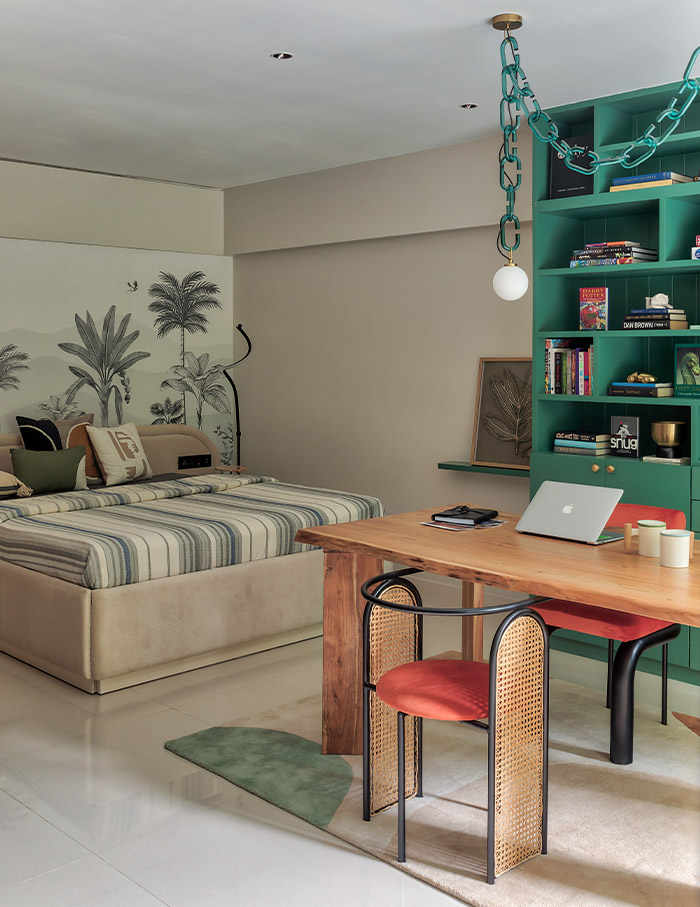 The large windows, the use of plants, hints of green and even the out-of-the- blue tropical wallpaper in the den, pay a soft tribute to the trending tropitecture influence in design. The space is colour-blocked yet balanced, off-set with the very hip use of concrete finishes. The layering too is on trend—almost like a thoughtful anarchy of disparate design elements, like a distinctly Scandinavian coffee table, layered carpets, oakwood floor set in herringbone and a mad pop coloured bar.