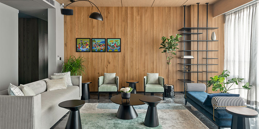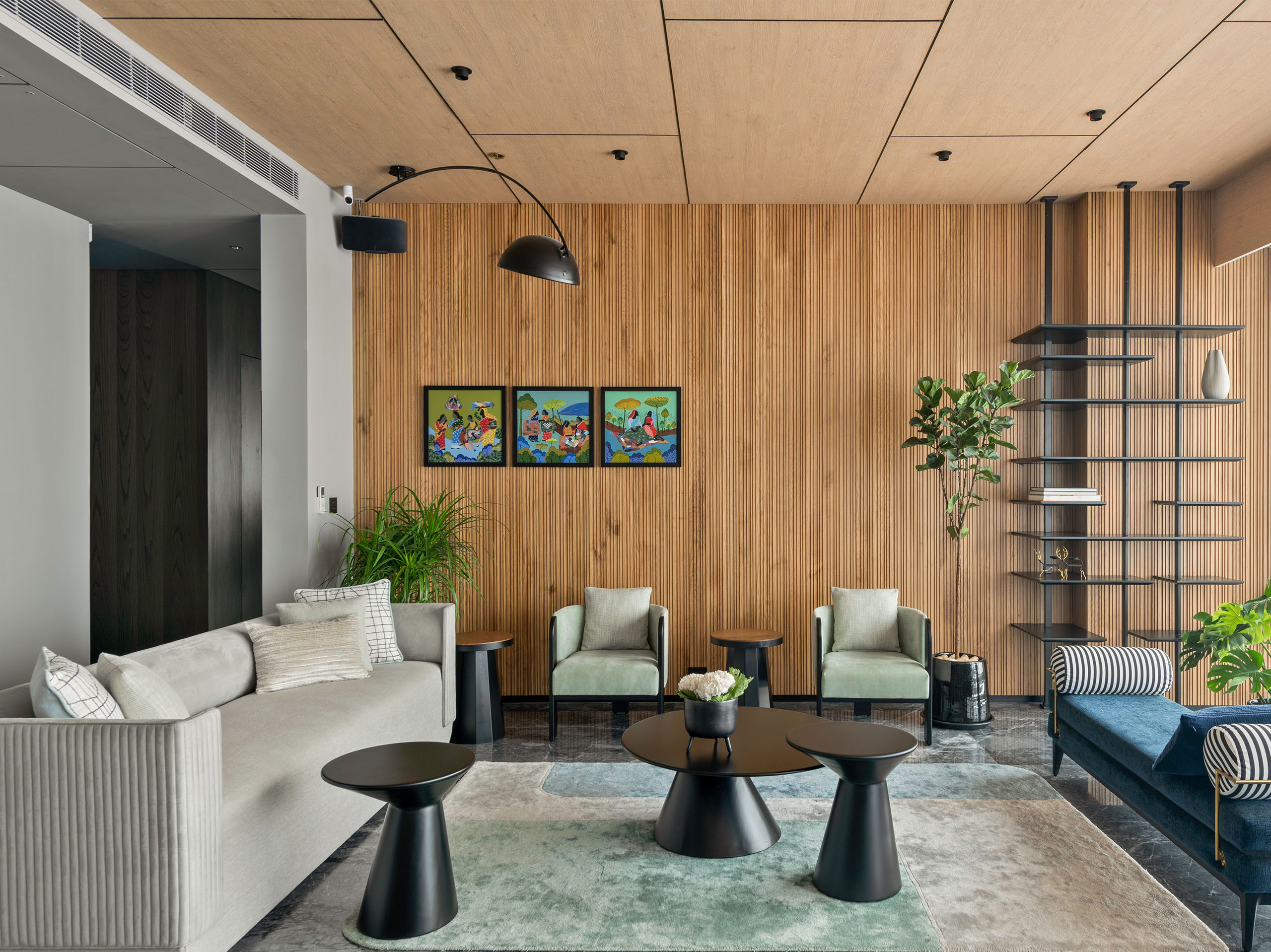 The space develops as an antithesis, with the subdued tones of the corridor transitioning into the inviting living area bathed in natural light and greenery. A light oak wood fluted wall continues to envelop the ceiling with light oak wood panels to meet a textured white mist panel, which forms the shell for the space. An eclectic mix of carefully curated design elements gives the space a lightness.