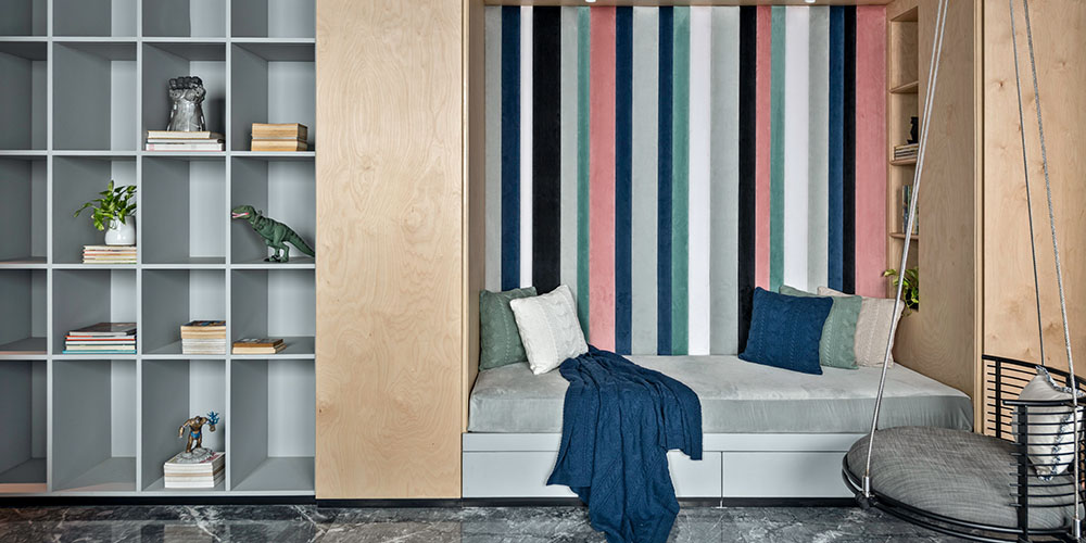 With varying shades of blue along the walls, the children’s bedroom is designed to let the young one’s imagination and creativity take flight. A niche formed within a storage wall and blue-grey shelving gives an openness to the space.