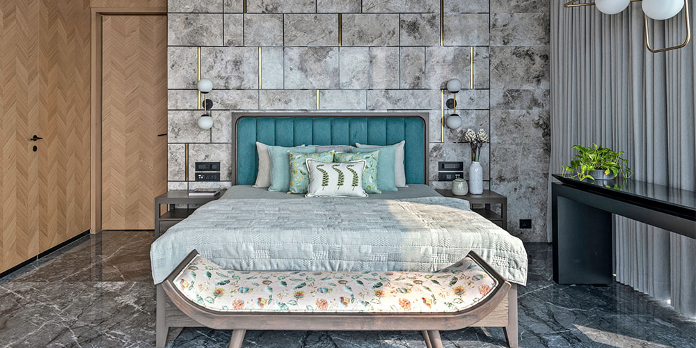 The marble from Nitco reigns in the primary bedroom; Photographs by PHX India