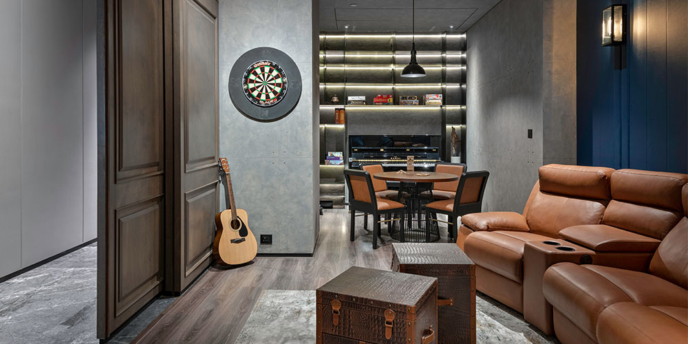 A series of black veneer sliding panels open into the family den, a heavy space with deep blue leather panelled walls, offset by black stained birch wood panels. A black metal unit forms the backdrop for the space, complete with a game table and dart board. Leather and wood furniture set the mood to unwind and let loose with a game or a movie.