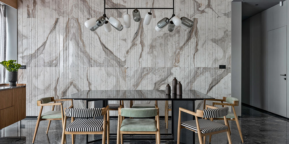 The dining room is a calming space with a dining table from The House of Things, chairs from Ek Design, accents from Ikai Asai and a suspended light from Hive Home against a backdrop of fluted marble from Nitco; Photographs by PHX India