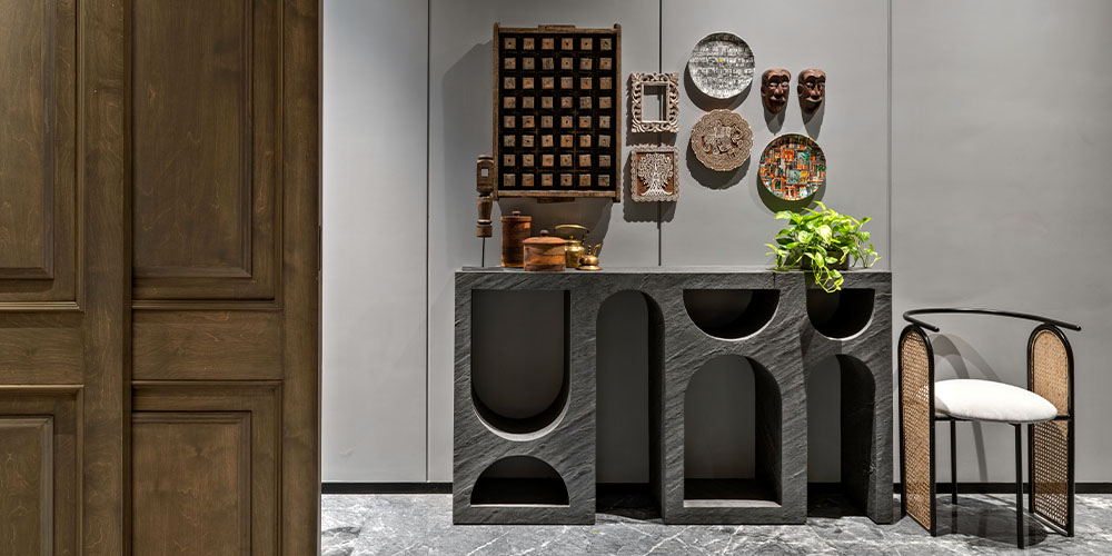 A long, darkened passage greets one upon entry and is a soothing respite from the chaos of colours one encounters on a busy day. An accent wall of art collectables and travel curios with threadwork panels define the space.