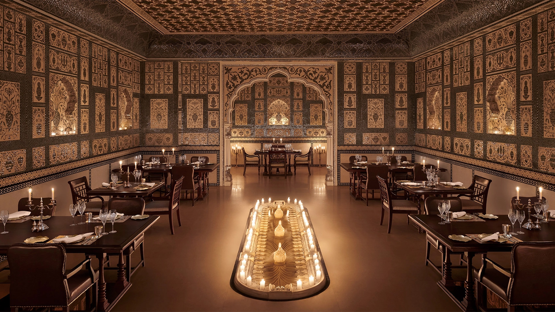 The dining hours here never falls short. From the Aravalli Dining Room, Jharokha, The Peacock Lounge, The Amber Terrace and Jamavar, each of which is unique in its own way, characterised by snug seating and exemplary gastronomy. Inspired by the Kashmiri Jamavar shawls, Jamavar is a showcase of artistry while retaining the architectural grandeur of Mohan Mahal, complete with 3,50,000 hand-cut Thikri mirrors and 18-carat gold leaf, further enhanced by musical performances in the evenings.