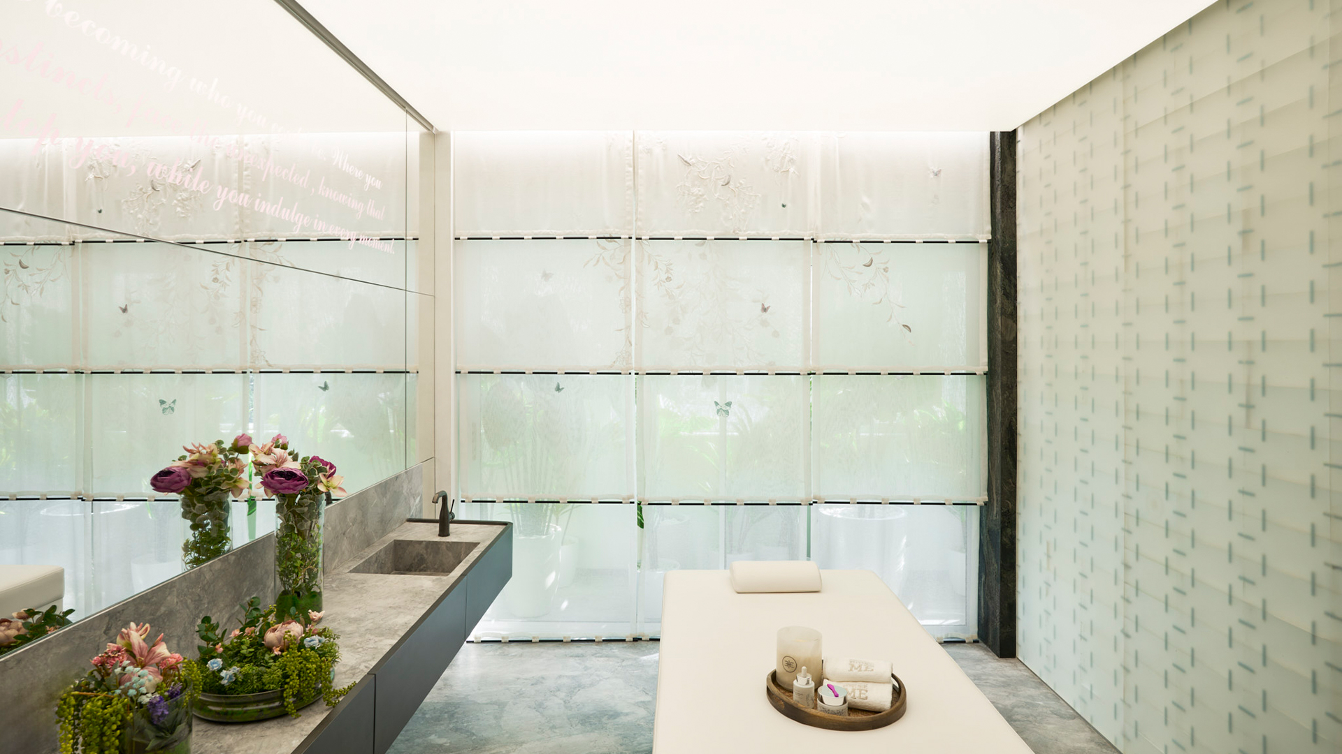 What does luxury look like when it chooses to be felt rather than flaunted? The new space for FutureMe responds with bedazzled and immersive attributes that reflect the philosophy of a soothing and nourishing skincare brand. Here, art and lighting come together to create a world that draws from diverse dimensions but is grounded in tranquillity. At its core is a custom-designed glass chandelier that serves as the emotional and visual centrepiece of the space. Kayzad Shroff had visualised a lighting fixture that takes inspiration from the crown of thorns that was placed on Jesus’ head with spikes that spread out in all directions, disturbing the notion of a perfect circle while radiating diffused light. Designed in collaboration with Arjun Rathi, the chandelier’s asymmetrical and crown-like shards dissolve the boundaries between sculptural art and lighting design, becoming a beacon that leads people into the contemplative world of FutureMe.