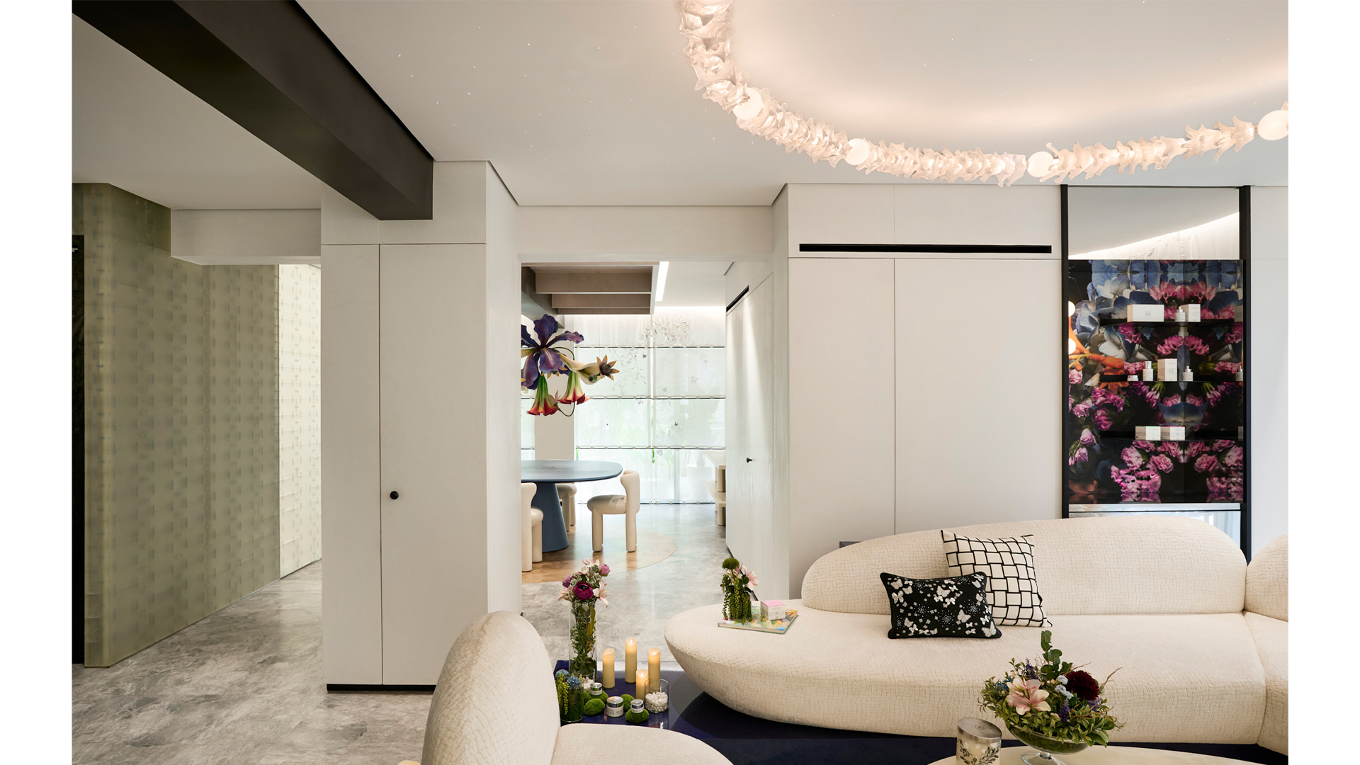 What does luxury look like when it chooses to be felt rather than flaunted? The new space for FutureMe responds with bedazzled and immersive attributes that reflect the philosophy of a soothing and nourishing skincare brand. Here, art and lighting come together to create a world that draws from diverse dimensions but is grounded in tranquillity. At its core is a custom-designed glass chandelier that serves as the emotional and visual centrepiece of the space. Kayzad Shroff had visualised a lighting fixture that takes inspiration from the crown of thorns that was placed on Jesus’ head with spikes that spread out in all directions, disturbing the notion of a perfect circle while radiating diffused light. Designed in collaboration with Arjun Rathi, the chandelier’s asymmetrical and crown-like shards dissolve the boundaries between sculptural art and lighting design, becoming a beacon that leads people into the contemplative world of FutureMe.