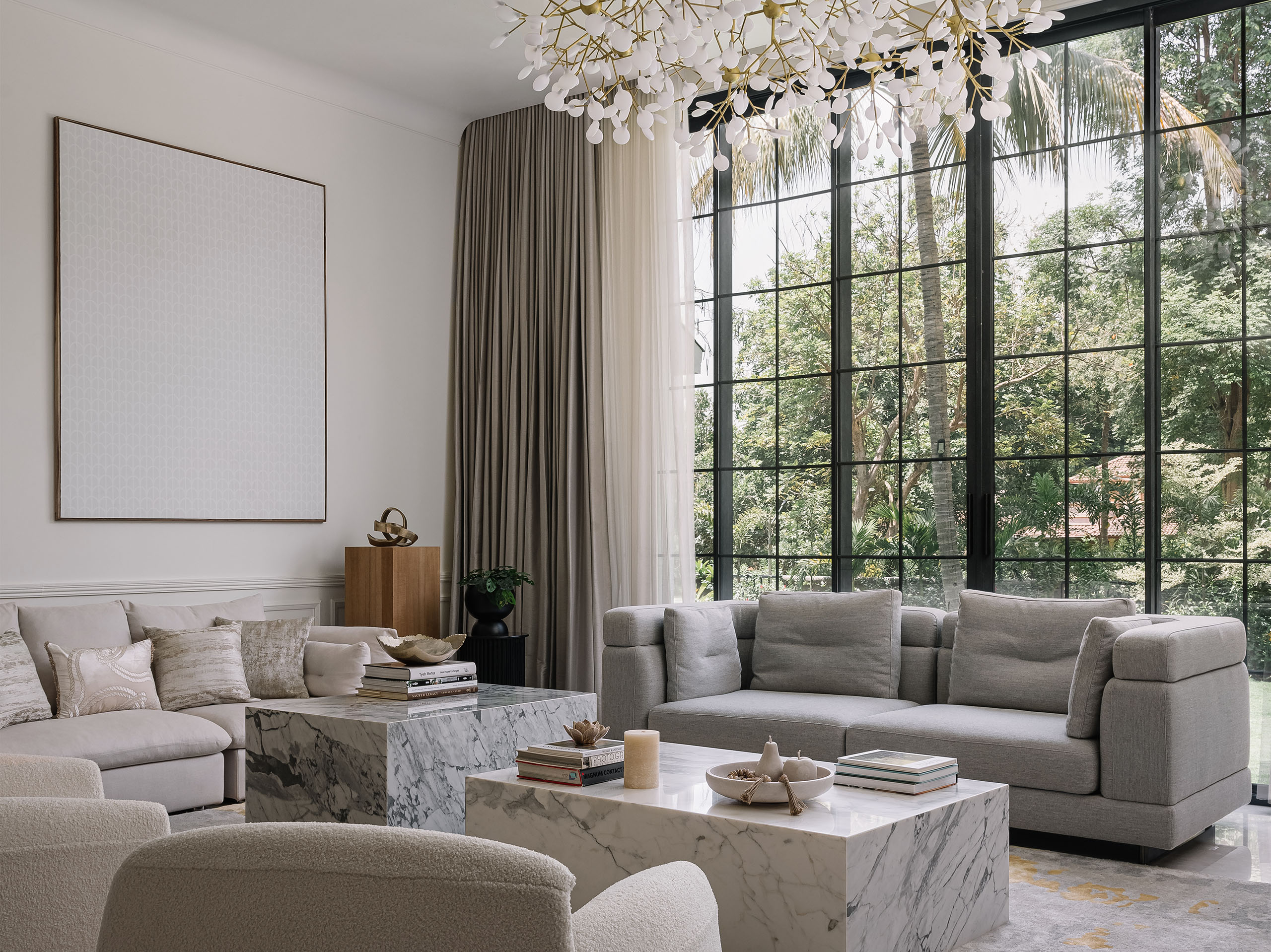 It all started with the homeowners’ desire to renovate their 3,100 sq ft house. However, after discussions and ideation, the decision was made to extend and construct an all-new cove sprawling double the size of 6,000 sq ft area, while also retaining a garden and pool. The design concept aimed to achieve elegant and timeless European aesthetics with a dash of modernity.