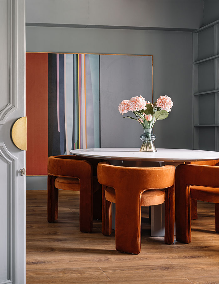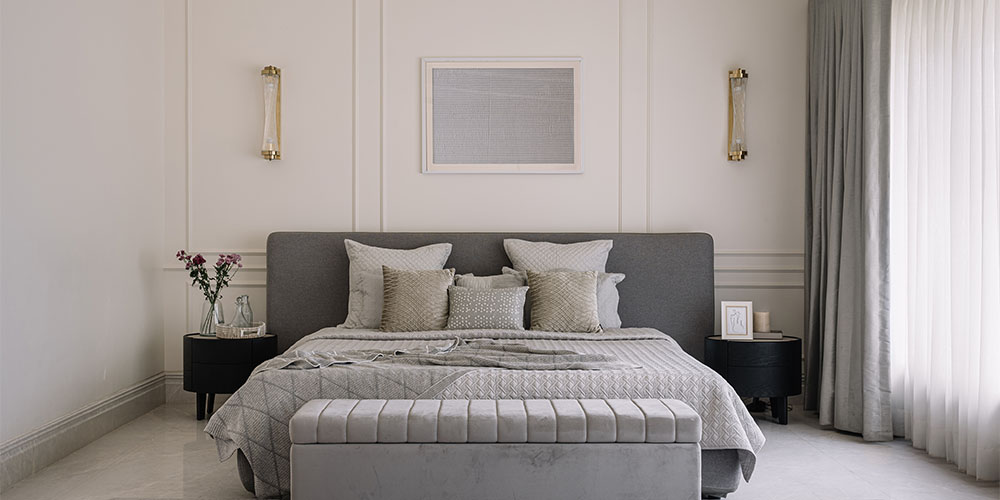 In essence, the design focuses on efficient use of space and incorporates elements such as large windows, curated art, vintage chandeliers, and ornate architectural details to enhance the overall aesthetic. As Parthavi sums up, “Classic European Style is characterised by its use of symmetrical designs, neutral colours and traditional furniture pieces. It often features ornate architectural details such as intricate mouldings, large windows and beautiful arches, grand foyers with sweeping staircase, elegant formal rooms, as well as antiques, chandeliers and artwork. We employed the style but the approach was minimal, borrowing subtly from its elements but not being blatant about it and maybe adding a hint of modern.”