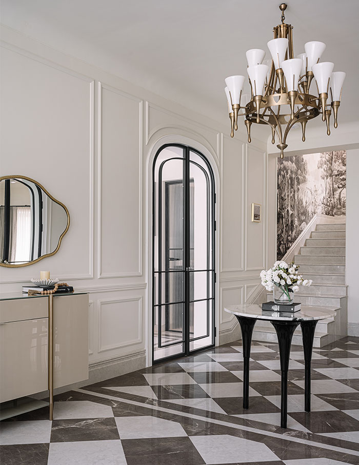 Inside, the entrance foyer comes to life with a checkerboard marble flooring in white and beige grey. An intricately detailed iron gate with floral ornate work leads to the internal foyer area, where one sees a central table with a tall glass vase, a vintage chandelier, a console and shoe rack, seating area for visitors, and access to a niche powder room and staircase.