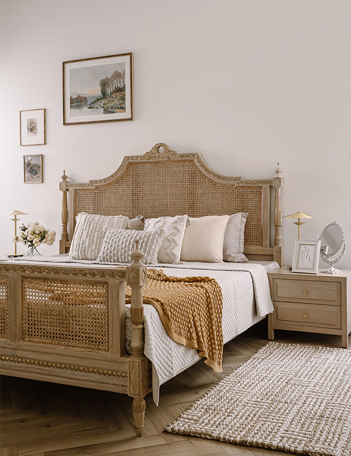 The guest room, located off the formal sitting area, is designed with rattan furniture and follows the overall theme of the house. The parents’ room, opposite the guest room, has a warm and English-inspired feel with four-poster beds.