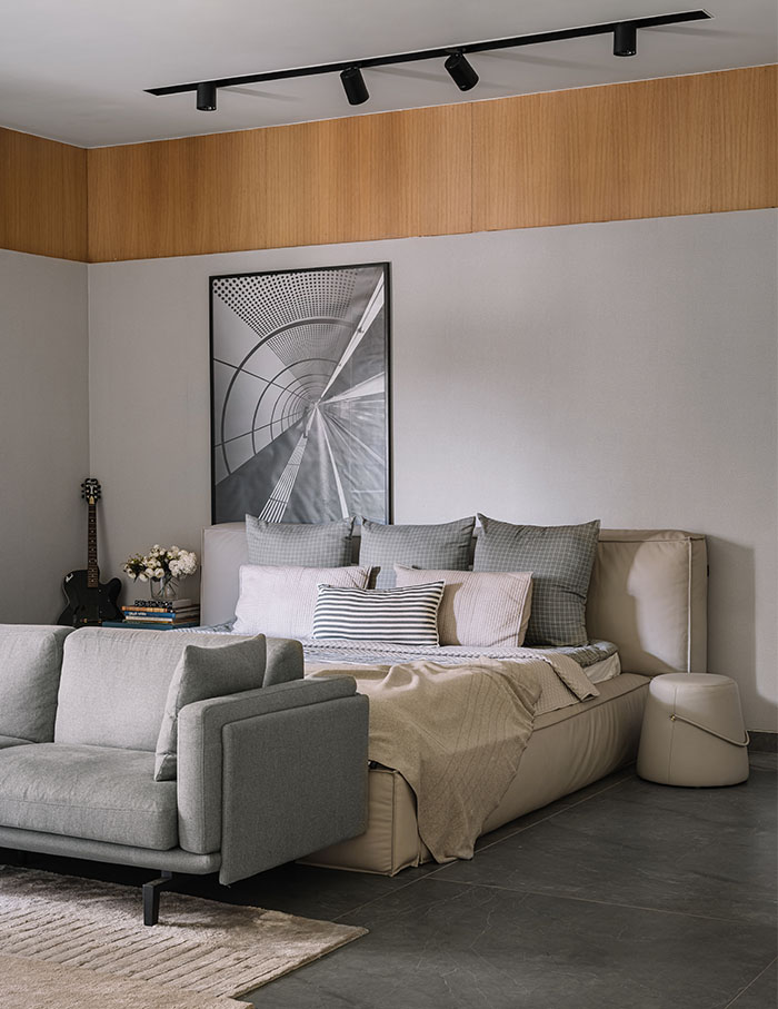 The staircase area, wrapped around the lift, features black and white-toned wallpaper and vintage lights. Going up to the next floor, there is a pause area with an interesting console and curated art. From there, one can access the son’s bedroom, which has a younger vibe with light wood furniture and contemporary minimal art.
