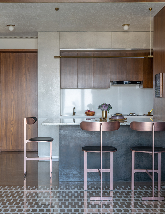 A compelling contrast by the mix of the cosy teak wood and the cool-to-the-touch margarine plaster on the walls is enhanced by the mesmerising movement of the Hybec lights. Scarpa Terrazzo was utilised for the living room floor, with beige Italian marble walls coated in lime plaster and a concrete texture ceiling.