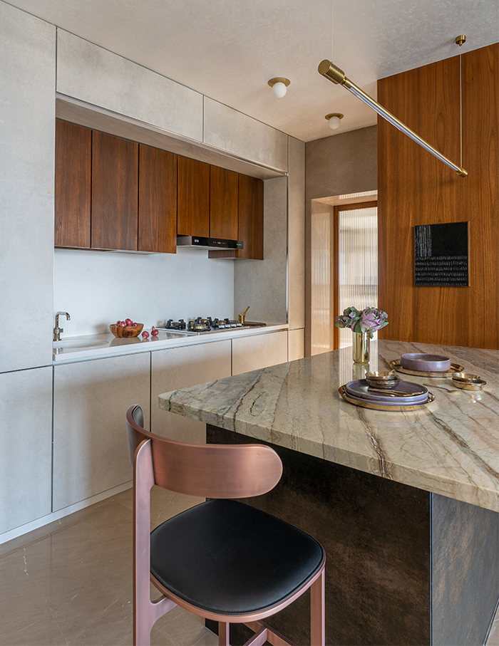 Metamorphosing into unique, elemental design clues — a sleek marble dining table, lights from Jade Design House with the bar unit set against the teakwood wall, and shades of earthy hues blending well with the decor, setting up the home for an elevated living.