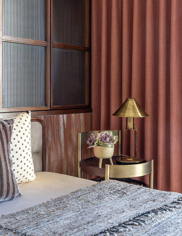 The bedside tables and bed bench perfectly complement the bed linen from Yamini. Focusing on the headboard meticulously crafted from Scarpa Terrazzo weaves a whimsical style tapestry.