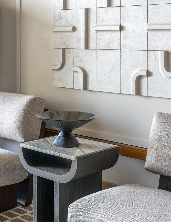 Resurrected were certain up-cycled artworks and decor given by the client, seen throughout. Artwork by Meghana Patpatia, sourced from Tao Art Gallery, adds to the artistic ambience. A unique 3D art piece created by the design studio captivates the attention of all who enter.