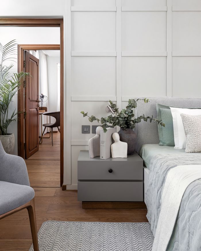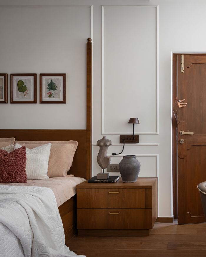 Home to the bedrooms, there’s a visible hush on the second floor. A grand four-poster bed in the master brings Kerala’s influence full circle. From the wardrobe shutters to the doors, an abundance of wooden accents imbue each bedroom with warmth. Everything else is designed to fade into the periphery: the tone-on-tone 3D mouldings, patterns on the walls and the decor, all dressed in deliberate neutrals.
