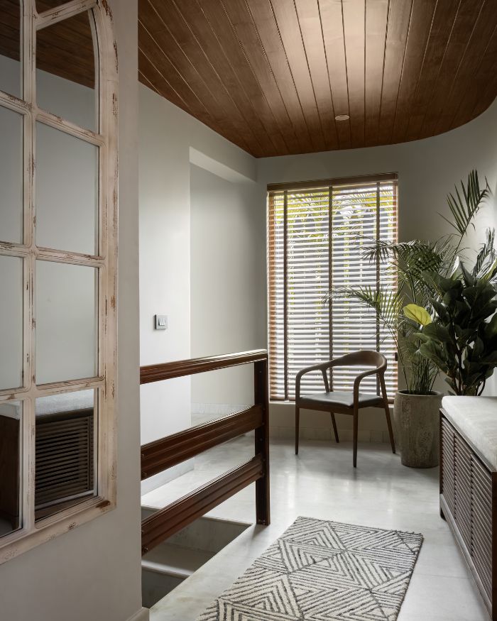 Another non-negotiable? Functionality. As Aakriti affirms, “We wanted to create a maintenance-free area that reflected the family’s deep-rooted love for natural materials and colours.” The original teak woodteakwood railing became the perfect launchpad to take the home’s design narrative forward, echoing the wooden accents that came later. Each detail has been devised keeping these fundamentals in mind.
