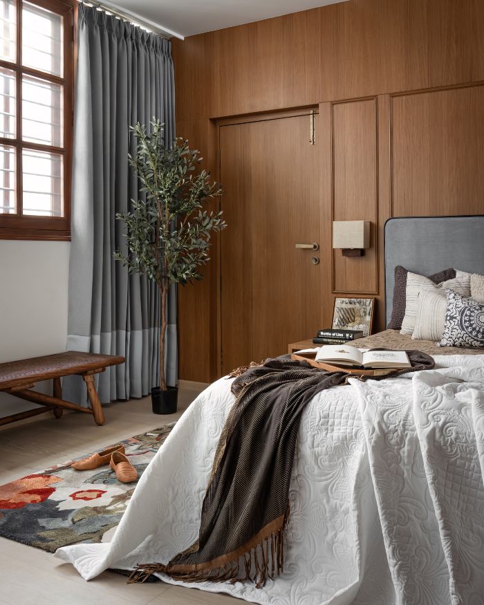 The bedroom has a bench from Dtale, rug from Jaipur Rugs, fabrics from Home stories and flooring from Squarefoot; Photography by Jubin Johnson