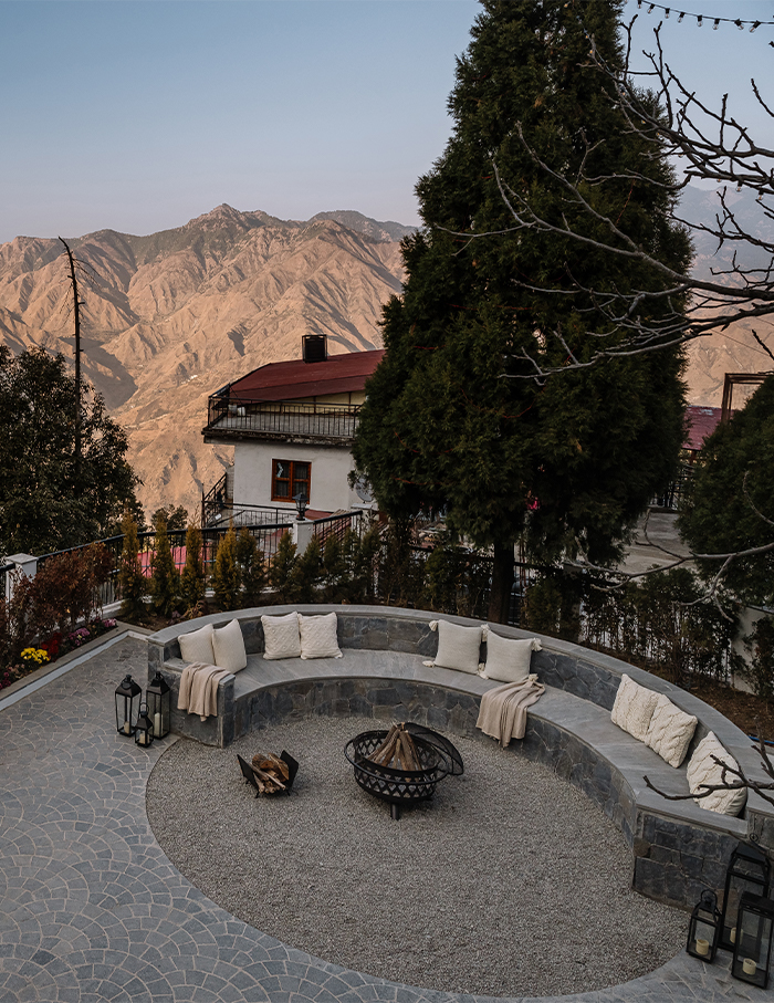 Towards the side is an old-fashioned outdoor bar and barbecue station, ready for summer evenings and tea parties. For soirees on chilly valley days, a semi-circular stone sit-out gathers around a fireplace, a perfect refuge for when the mountain air turns crisp.