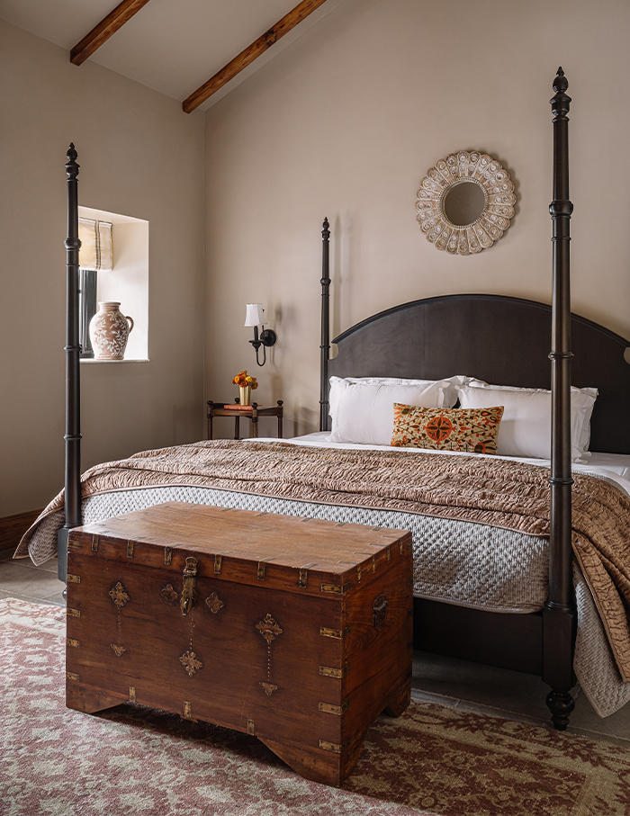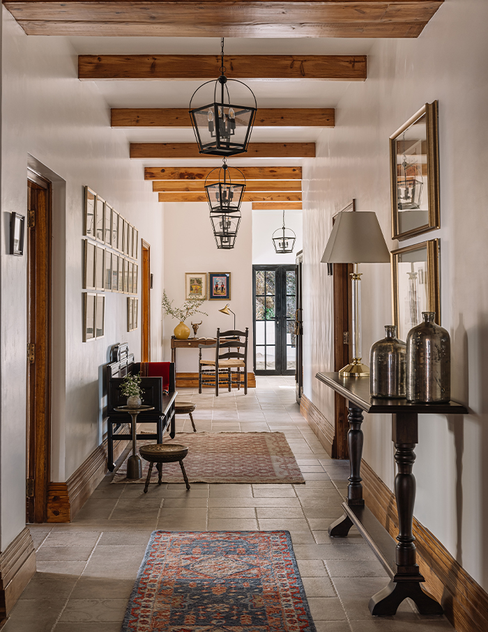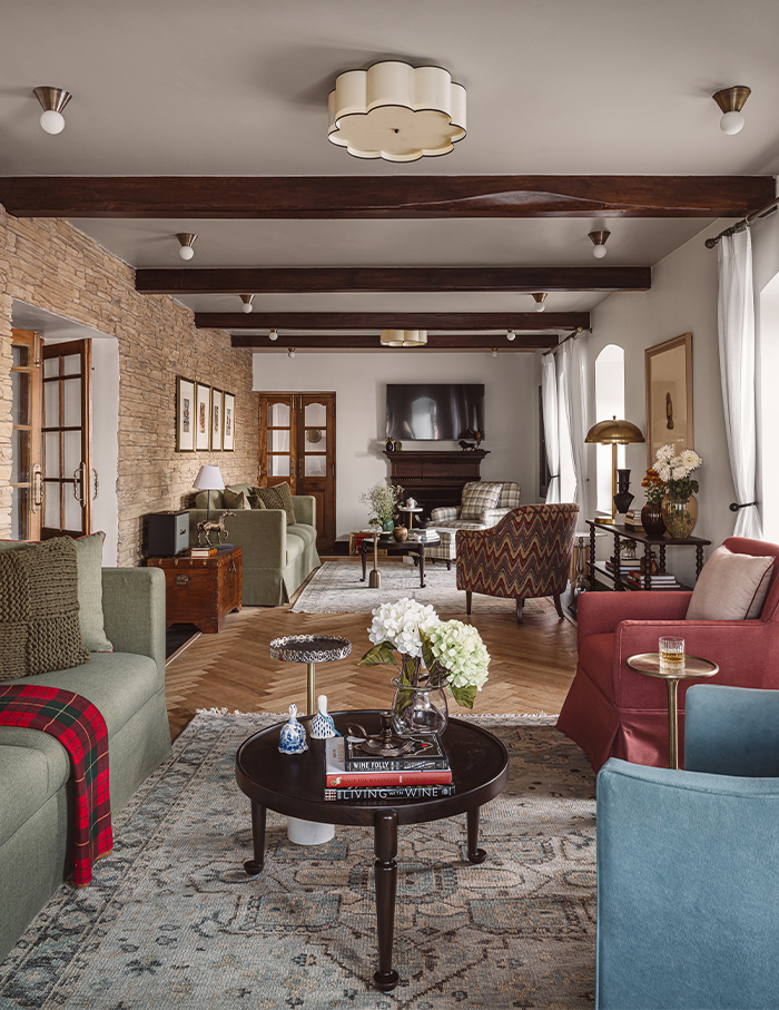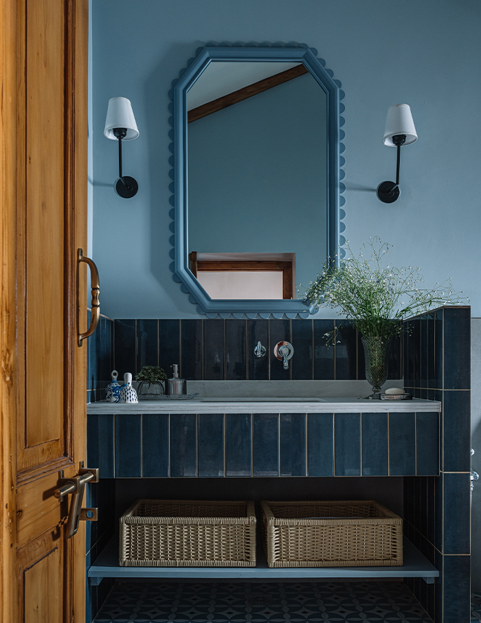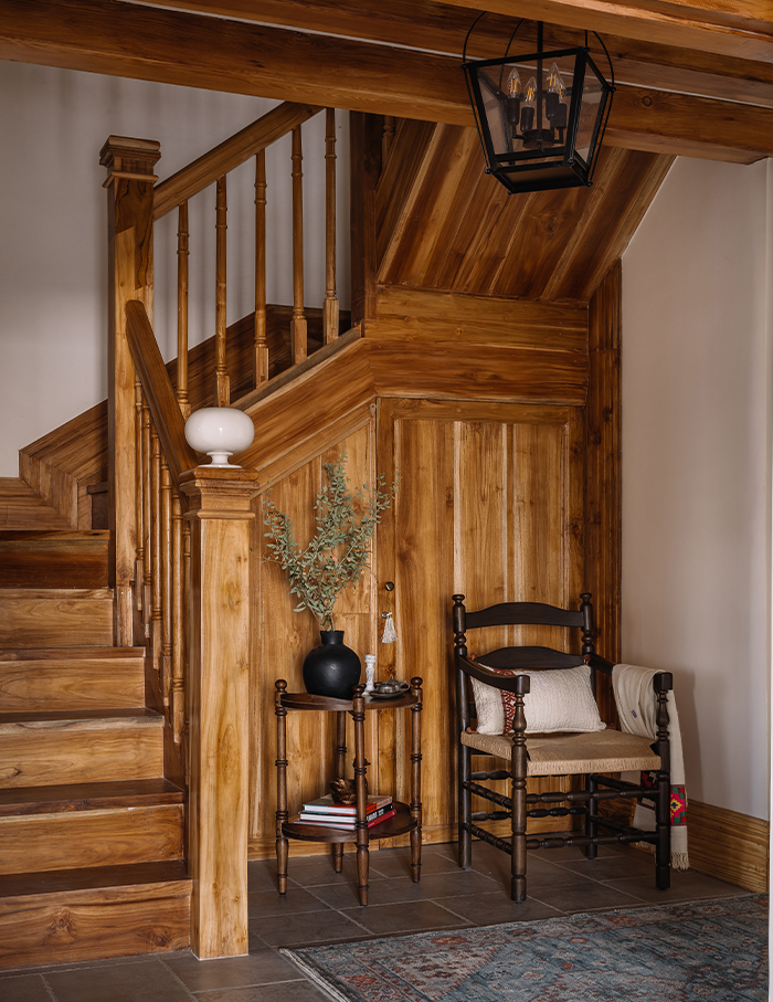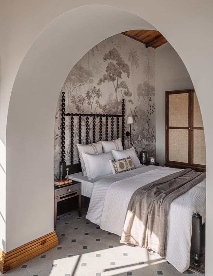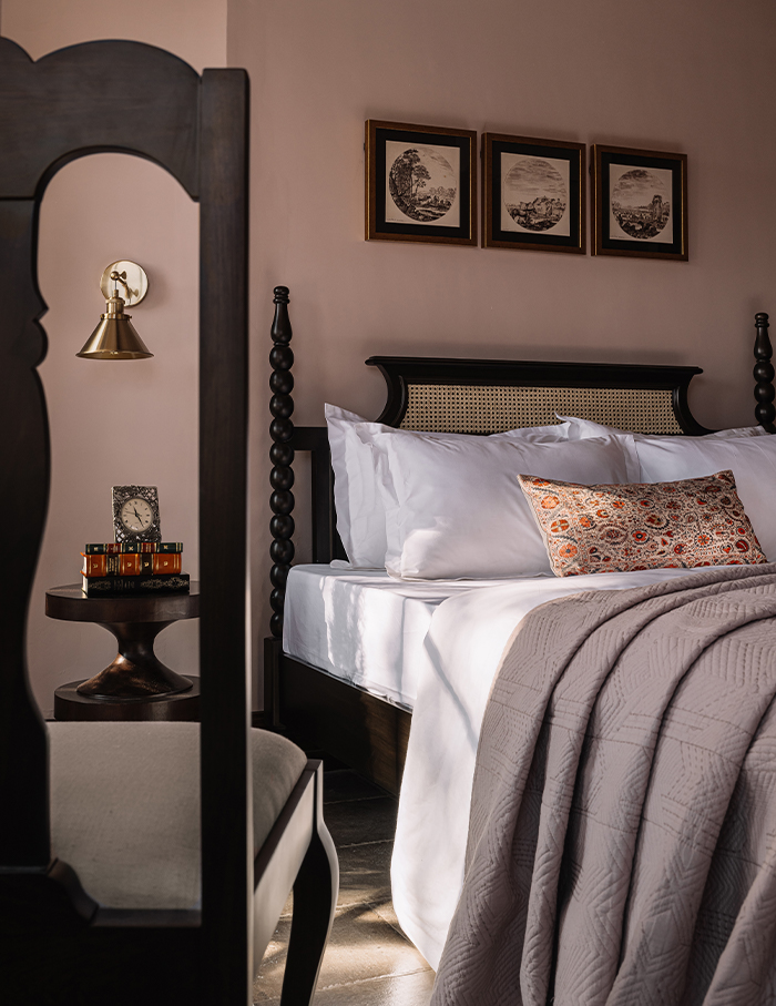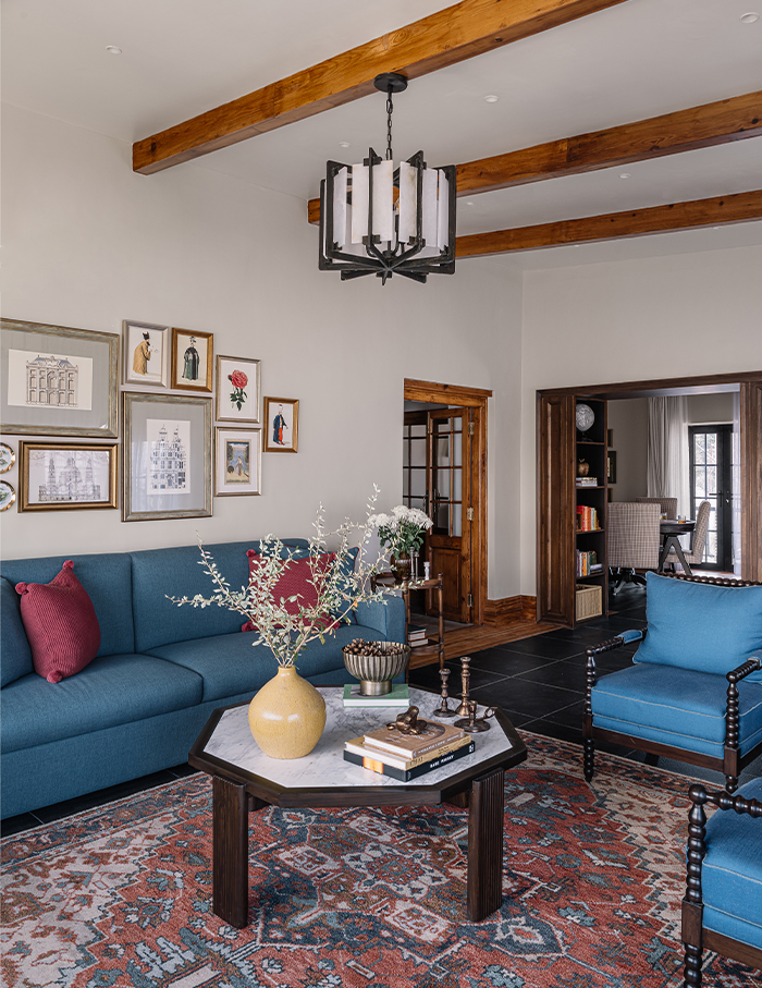 An ode to the glorious homes that once dotted the hills, the principal designer sought to pen the den’s story in stone and wood. While its thick lime-plastered walls, timber beams speak of time-worn elegance, the home had slipped into a state of disrepair. Its elegance softened by age, the current custodians of the space, drawn to the interiors of bygone era, desired to preserve the home’s soul while infusing it with the comforts of modern living.