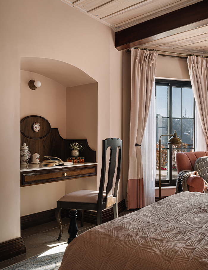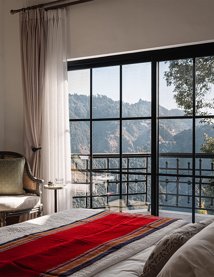 Sunlight spills through the bay window, bouncing off the polished gleam of antique wood, where the views of the Mussoorie hills roll out like a painting. Five bedrooms lie beyond, each swathed in jewel tones and open to sweeping balconies, where one can sip a morning coffee as the mist unfurls, revealing the valley below in slow, languorous waves.