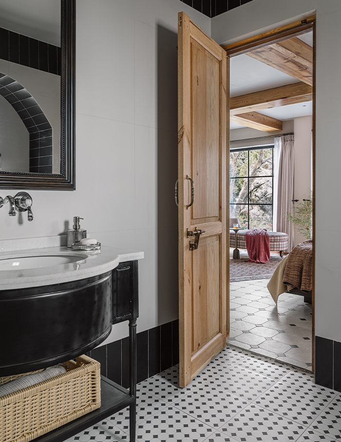 Calling for structural changes, a newfound openness awaited the annexe, which now houses the kitchen and staff quarter, allowing the space to unfold expansively. A grand gate swings open revealing a neatly manicured garden, a stone pathway curves through which trimmed hedges frame the views that stretch into the valley below.