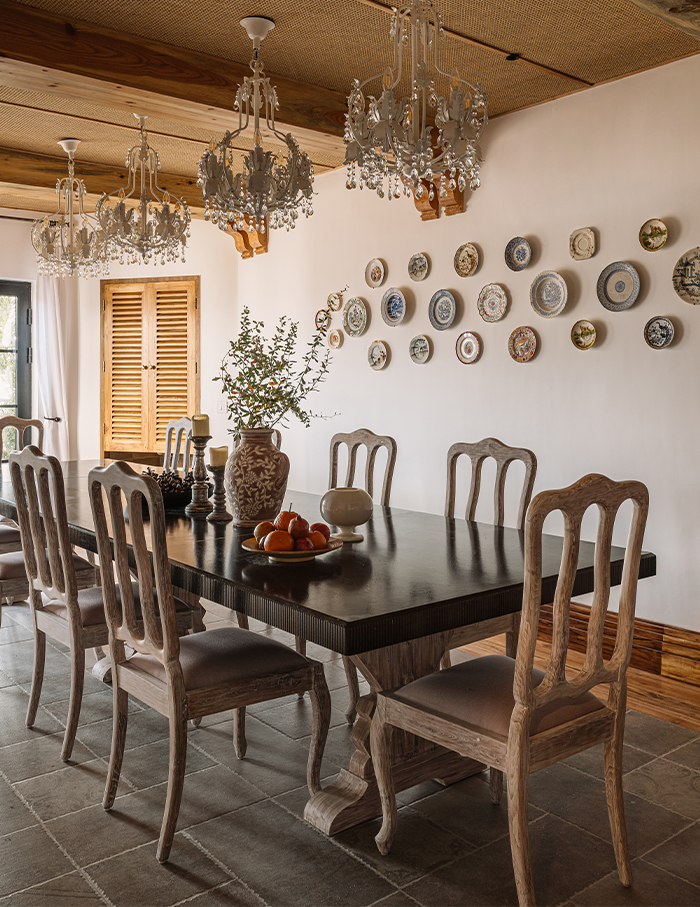 Beyond the passage, a private dining room unfolds, where a long black granite table takes centre stage. This space is underscored with textural elegance, its rattan-panelled ceiling glowing under the light of chandeliers while the walls are adorned with a beautiful collection of original vintage plates one one side and draped in woolen durries on the other.