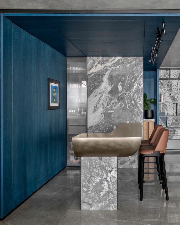 The perfect mix of artist and muse, this quiet neighbour of the Arabian Sea, seems forged of the blue expanse it faces. Designed by ADND, the 3,500 sq ft house features a minimalist design and a colour scheme reminiscent of its coastal company.