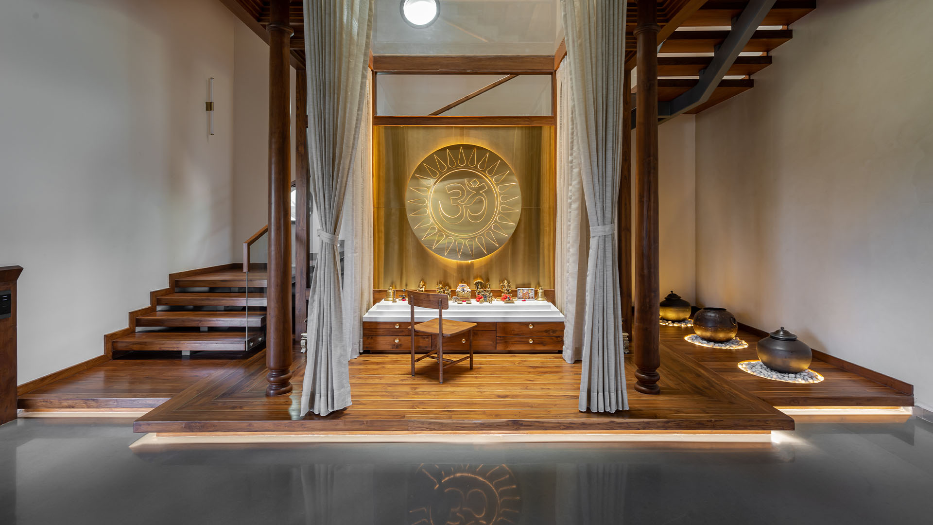 Concrete and granite sketch a bold outline, but inside, the mood softens. Light slips through cut-outs and tall windows, falling gently on stone flooring and wooden details. At the centre sits a temple, steady and grounding, with life unfolding around it in measured layers.