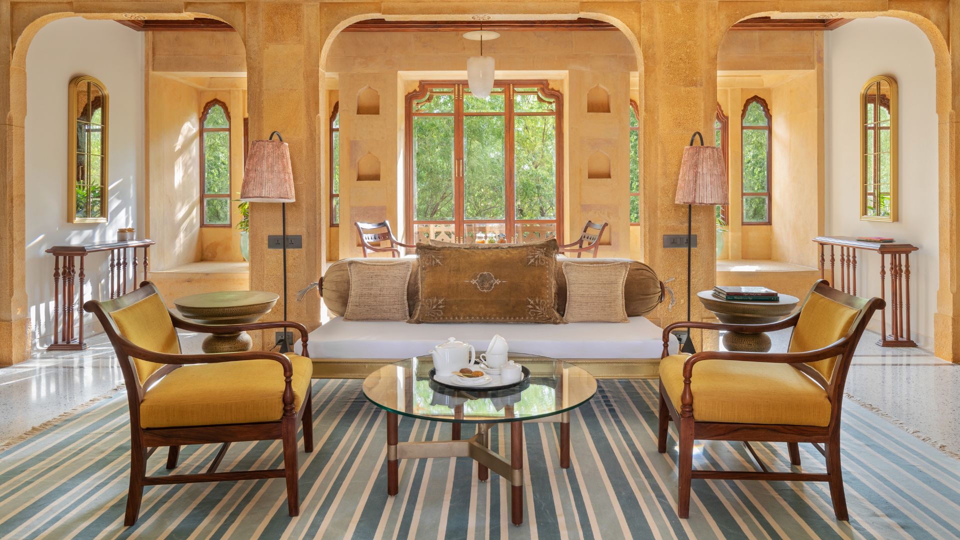 Today, the merchants have left. The Silk Route is no more. But Jaisalmer lives on, and so do the memories of its illustrious past: a key component that first drew Founder Manvendra Singh Shekhawat of the Suryagarh Hotel to the Golden City. The Thar Apartments, a new 12,000 sq ft addition to the hotel’s awe-inspiring edifice by Ayush Kasliwal of AKFD (Ayush Kasliwal Furniture Design), builds upon this very storied past. His inspiration? The long-extinct desert traders themselves.