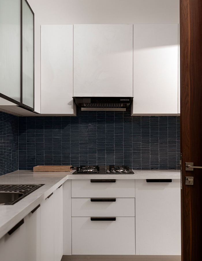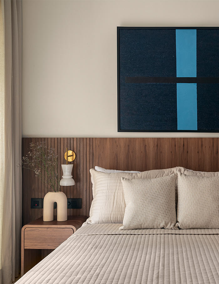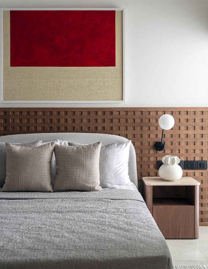 Moving further, the primary bedroom stands independently while two accompanying bedrooms echo of simple sophistication. Yet, drama is not lost — deep hues punctuate the decor, while Calacatta Viola marble reappears alongside plush artworks in ruby, emerald, and sapphire tones. “The compact layout required creative solutions to accommodate seating, conceal a handwash area, and integrate a tranquil pooja space.”