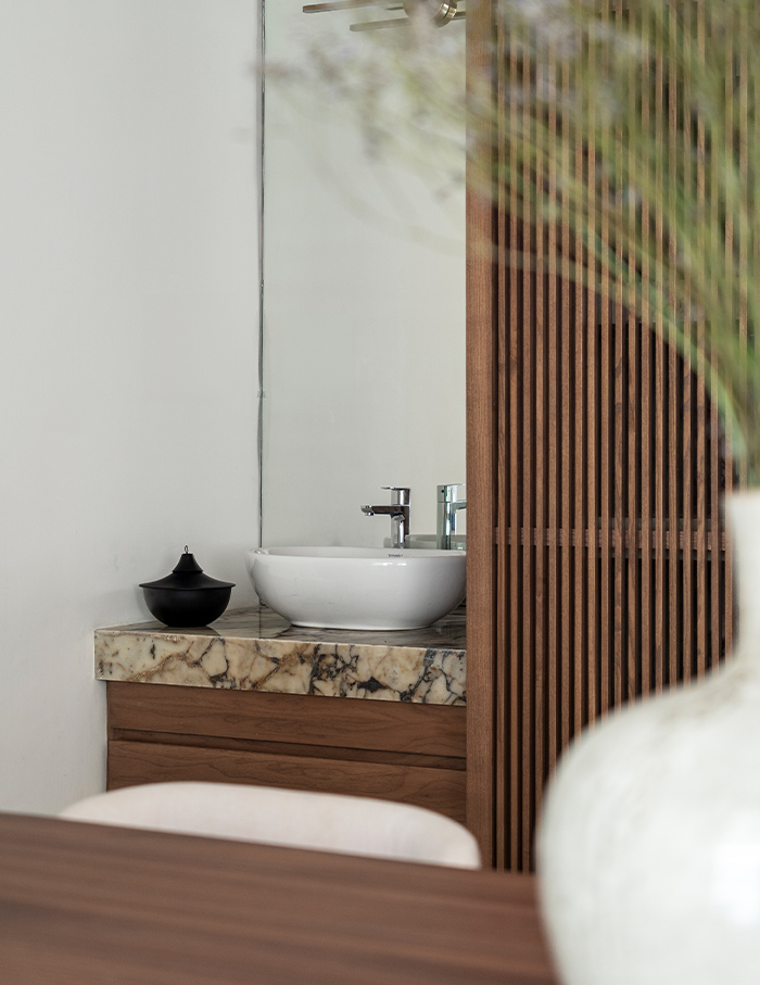 “The homeowners, Appaswamy Real Estates, envisioned a home — minimalist yet warm, with a balance of sophistication and functionality.” She further explains, “For this compact home, we chose a minimal and quiet design approach, with luxury expressed through intricate details and sustainable materials.” Here every discovery echoes a tale of thoughtful design.
