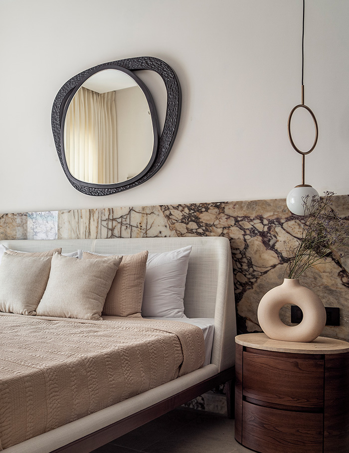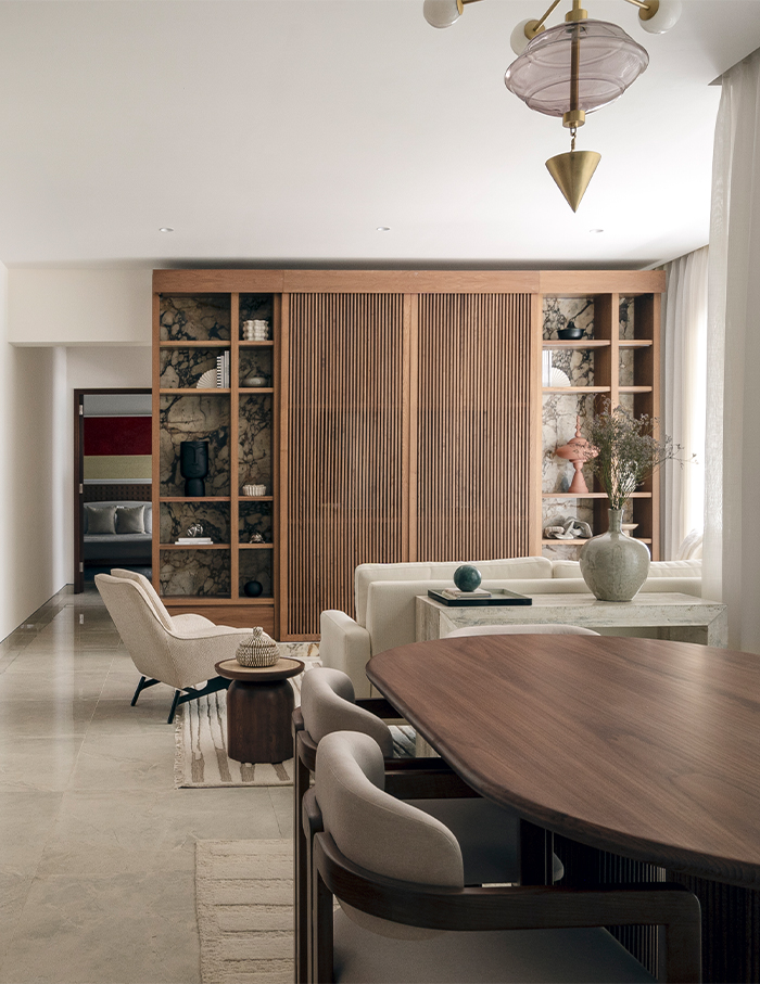 “Our philosophy is to create spaces that balance luxury with warmth and modernity with tradition. Titled Marmo Home, it reflects this through its meticulous attention to detail—marble accents, bespoke furniture, sliding panels, and handcrafted finishes,” explains Amrita.