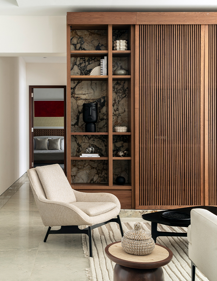 The entrance sets a striking tone, adorned with a Pichwai painting that flaunts jewel-like hues, ranging from sapphire blue to a mellow topaz yellow. Beyond this, the living room features a custom wall unit crafted from Calacatta Viola marble, paired with slatted wood panels that discreetly screen the television. A thoughtful touch, this playful yet functional element answers the perennial question: can a room be layered with intricate details while being spacious? The answer, a resounding yes.