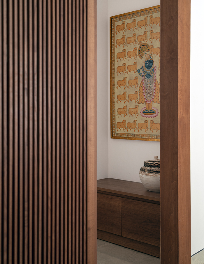 The dining room and the piece de resistance of the abode, the pooja room lie ahead, continuing the narrative of minimalistic design.
