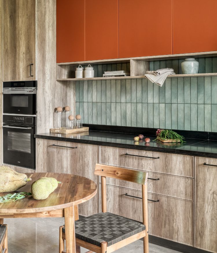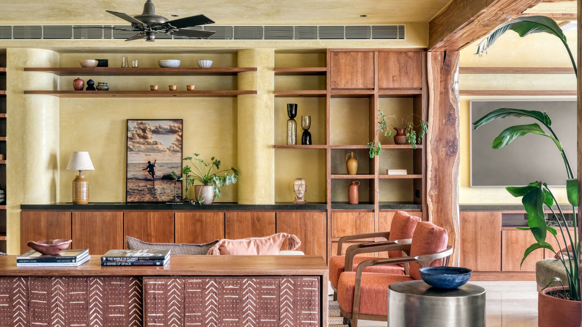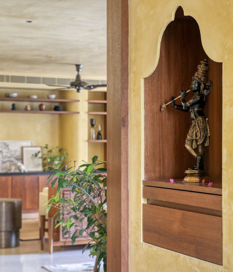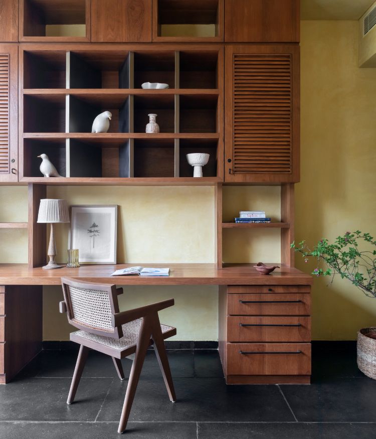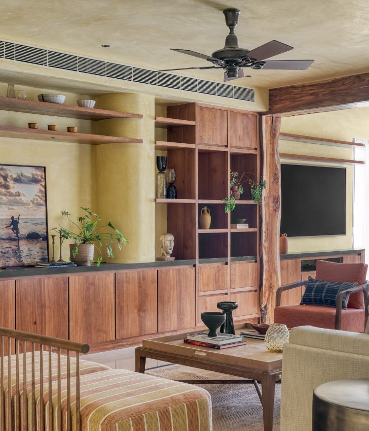 The living area opens up spaciously, with large west-facing openings letting in natural light. The space feels warm, thanks to the lemon-ochre lime-washed walls and ceiling. “We were particularly taken by the gradients it offered with its striated layers. Through conversations with the clients, the idea evolved into a material palette grounded in earthy finishes: lime plaster, reclaimed wood and natural veneer, all of which were repositories of rich gradients,” says Ninada and Komal. The living, family, and dining areas flow easily into one another, creating an open, connected space. A reclaimed wood frame leads into the family room, shaping it into a cosy corner for gatherings and moments to be spent in solitude. Beyond the living space, the dining area extends naturally, with black accents adding depth and contrast. The focus here is Kshitichitra, a centrepiece by Morii Design. Created in collaboration with artisan communities, it brings together elements of land, water and sky through Bela block prints from Kutch and Sujni embroidery from Bihar.