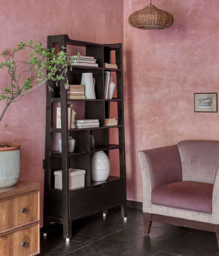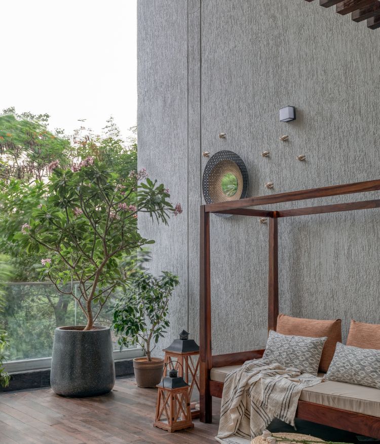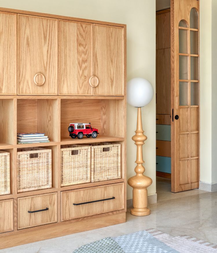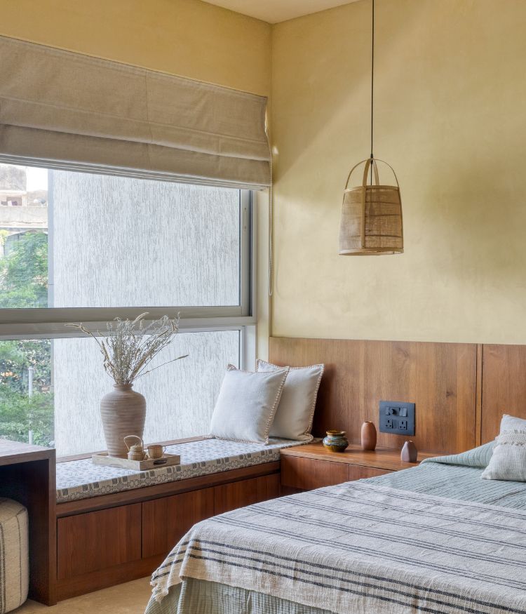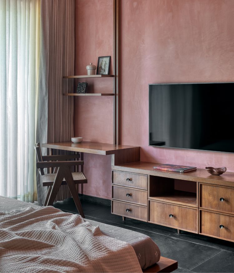 Treading further, the lemon-ochre tones give way to sienna rose, bringing a nostalgic feel to the master bedroom. “The clients wanted this space to feel distinct, a shift in palette that evoked a sense of repose,” says Komal and Ninada “We chose terracotta-pink lime-washed walls for softness, black river-wash Betamcherla flooring for its tactile quality, and reimagined the classic Victorian four-poster bed in a contemporary way, with slim wooden strips extending across the wall and ceiling to suggest an old-world charm.” they add. Pink tones continue from the master bedroom into the attached powder room, where they are paired with fluted wood finishes and a taupe stone floor.