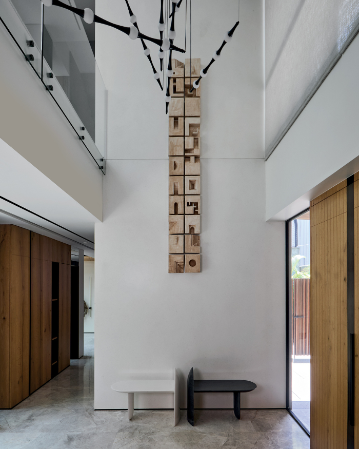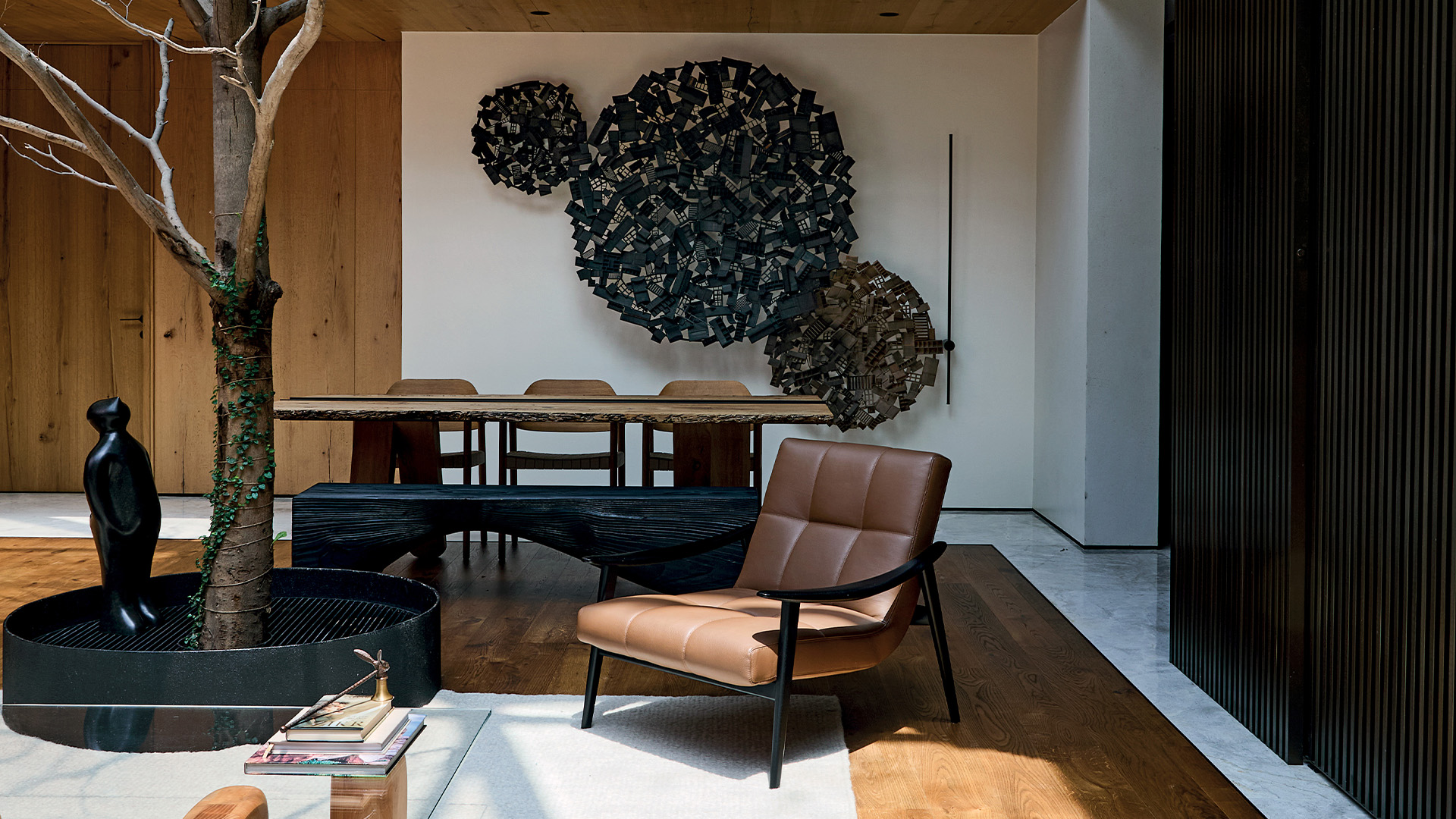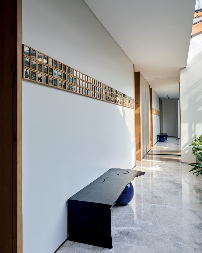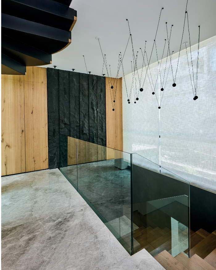 A strong linearity runs throughout, seen in the verticality of black basalt walls and how materials like marble and wood frame the home