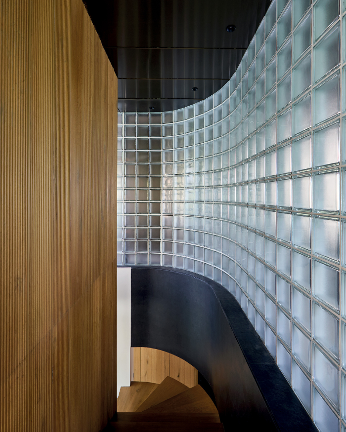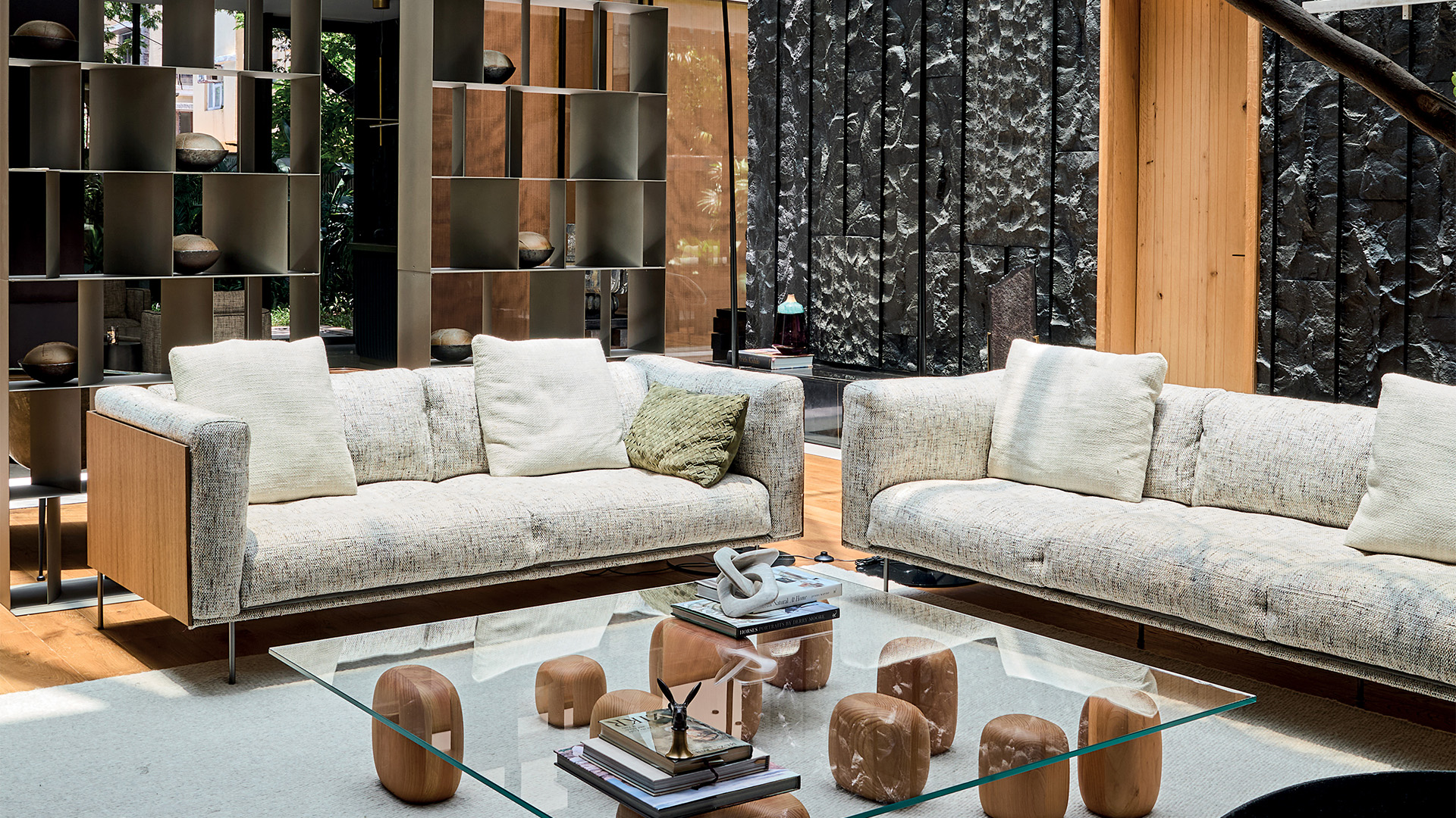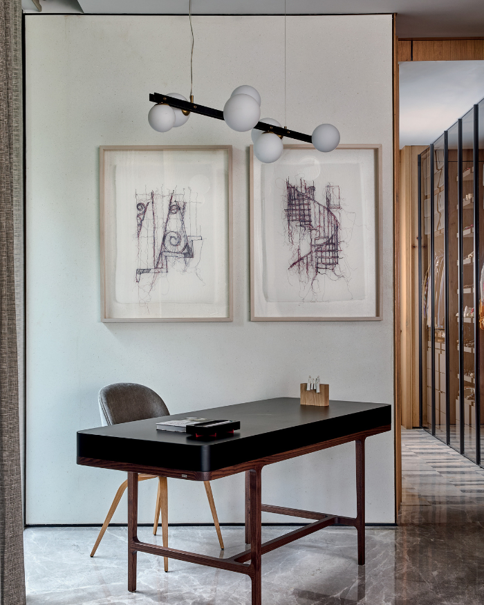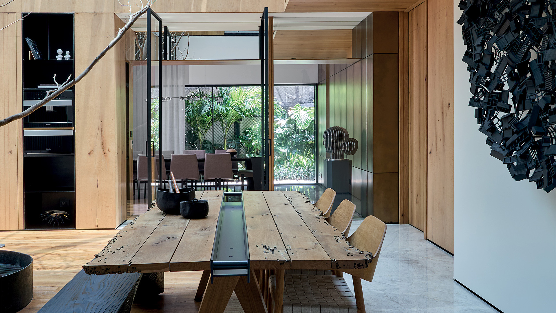 A strong linearity runs throughout, seen in the verticality of black basalt walls and how materials like marble and wood frame the home