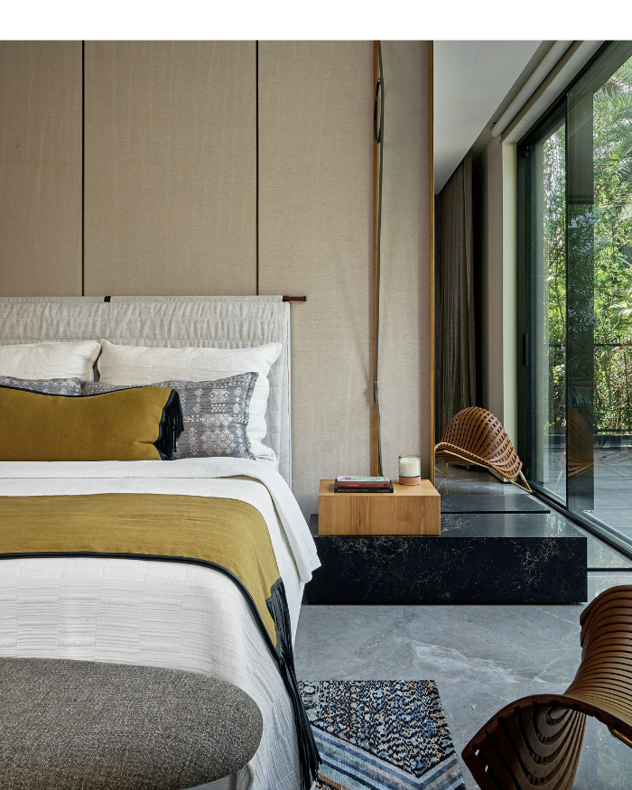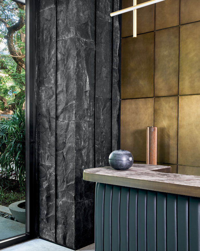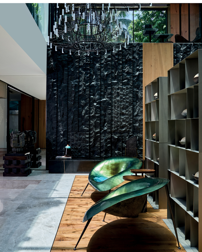 Viewed from the street, a two-storey bungalow in Juhu, Mumbai, is anodised aluminium panels and angular geometry. Once you enter inside, soft light fills the double-height courtyard where the simplicity of the colour scheme first strikes the sight. It’s not too long before one notices the textural play — of black basalt stone, of verdant green foliage, of smooth wood veneers that envelope the space. The home seems newly-built, but in fact, has been structurally retrofitted, utilising the bones of an existing structure to create a space that’s modern, functional and visually cohesive.