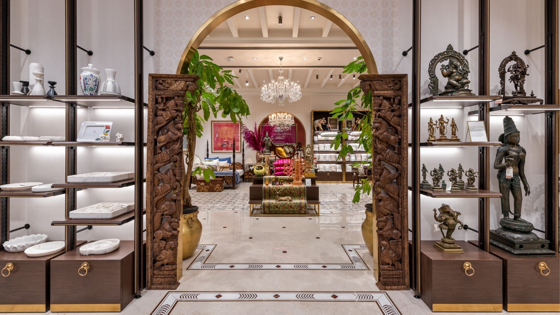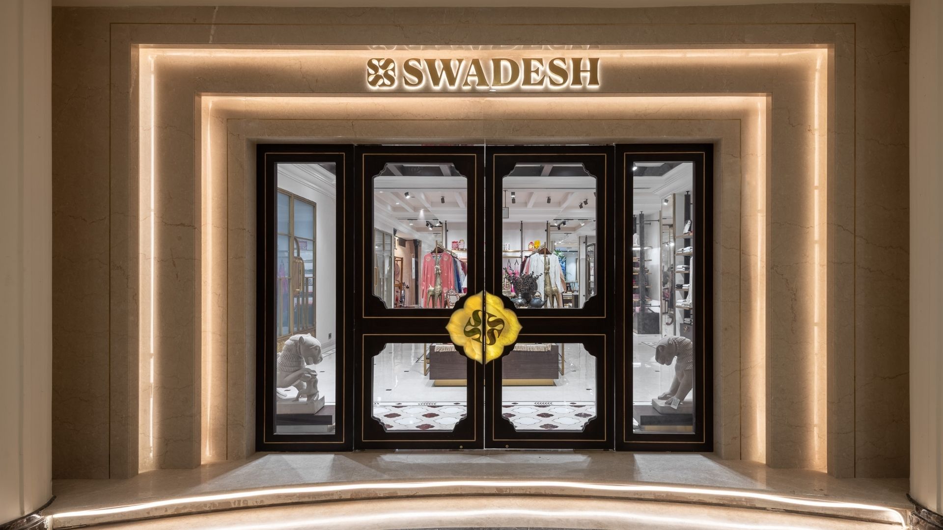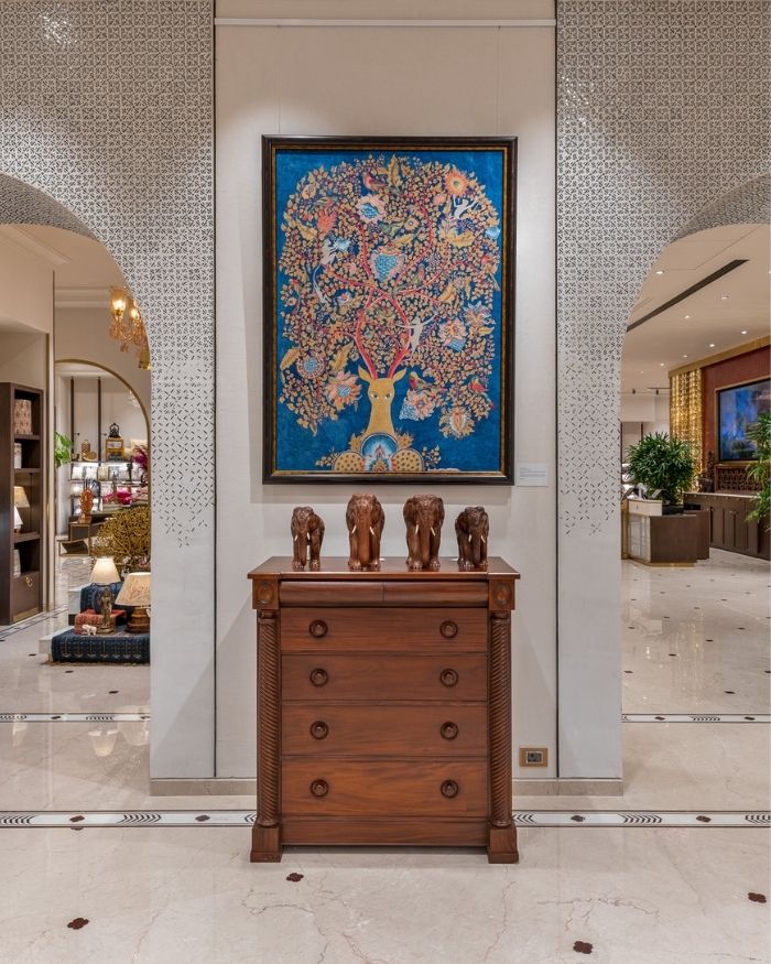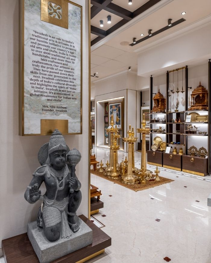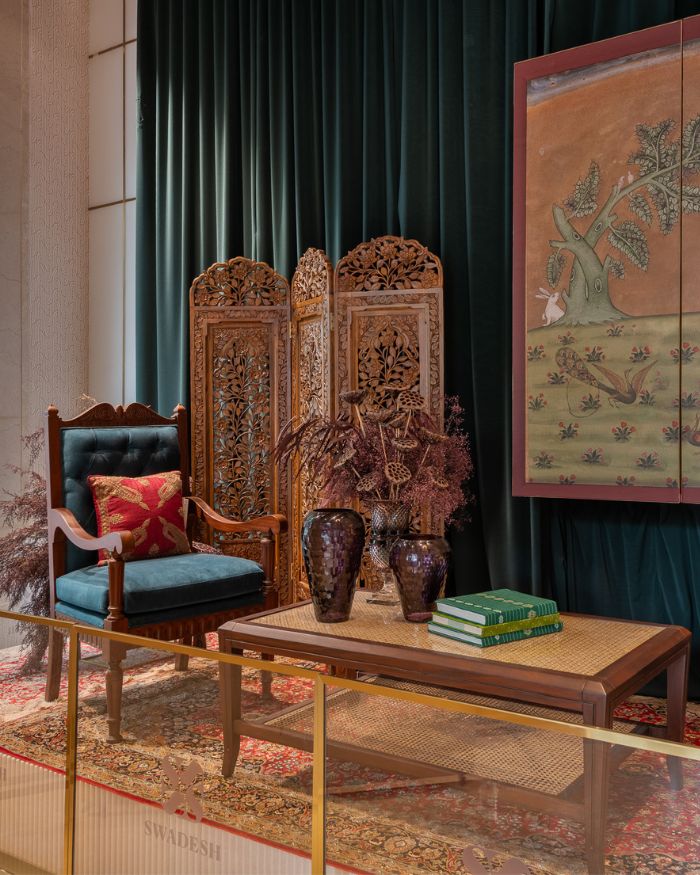 Within the imposing and time-honoured icon of Mumbai, Eros stands a foyer of backlit marble, with double doors of glass and handles bearing the Swadesh name. Details such as these set the tone for a heady welcome, a premonition for the carefully curated grandeur ahead. An initiative by Mrs. Nita Ambani, the brand is dedicated to showcasing the richness of Indian craftsmanship on a larger stage.